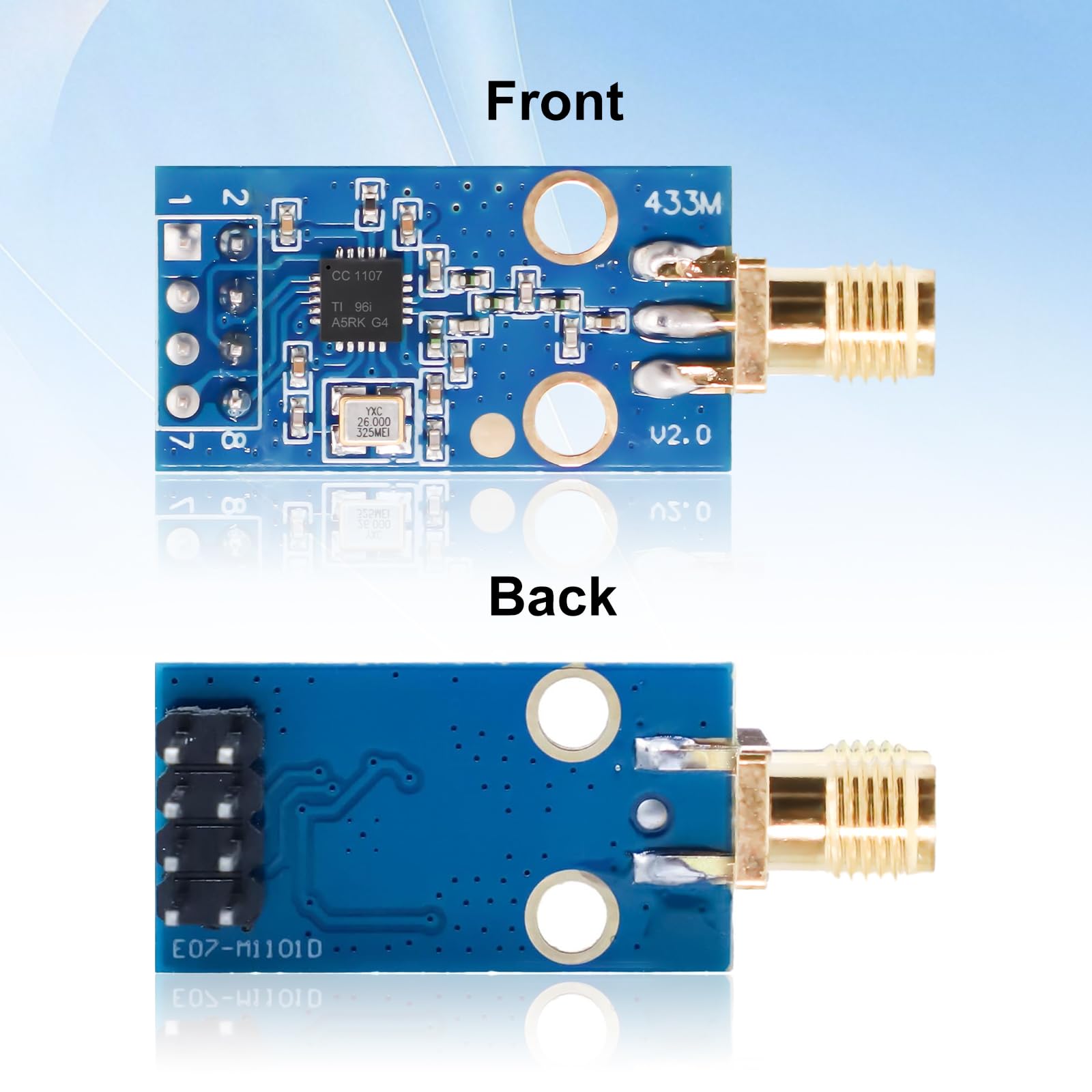 Description: Ce module sans fil CC1101 prend en charge la bande de communication 433MHz, fournissant une solution fiable pour votre transmission de données sans fil. émetteur Récepteur RF CC1101 Module AYWHP 433MHz Modulo Ricetrasmettitore Wireless Avec Connecteurs D'antenne SMA 1.9-3.6V DC Compatible Avec Arduino Kit Développement Transmission Données Sans Fil Avec une large prise en charge de la tension, une conception économe en énergie et une sensibilité élevée, le module est idéal pour le contrôle à distance, la maison intelligente, le réseau de capteurs sans fil et les projets IoT. Modes de fonctionnement multiples : le module prend en charge plusieurs modes de fonctionnement. 【Hautement intégré】Le module CC1101 intègre la puissante puce CC112xRF et la conception ARM 32 bits EnergyMicro Cortex-M3, qui est compacte et facile à installer et à utiliser. CC1101 Wireless RF Transceiver Board Module, 315/433/868 Le module fournit une interface d'antenne SMA standard, ce qui facilite la connexion à une antenne externe pour améliorer la couverture du signal. Faible consommation d'énergie : le module est conçu pour une faible consommation d'énergie. 【Communication sans fil haute performance】Adopte la puce CC1101, prend en charge la bande de fréquence de communication 433 MHz, possède une excellente anti-interférence et stabilité, garantissant un fonctionnement stable dans des environnements industriels complexes. Caractéristiques: Grande stabilité : le module est doté d'un émetteur récepteur RF très stable et très performant. 【Transmission à grande vitesse】Le module CC1101 prend en charge un taux de transmission de données allant jusqu'à 500 kbps, et la conception de l'antenne SMA externe améliore la force et la stabilité du signal pour répondre aux besoins de communication longue distance. Vitesse élevée : le module prend en charge la transmission de données à grande vitesse jusqu'à 500 kbps. 【Compatible Arduino】L'interface du module est de conception simple et peut être facilement intégrée à des plates-formes de développement telles qu'Arduino, prenant en charge une variété de projets de transmission de données sans fil.