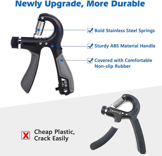 Renseignez-vous maintenant! Seulement 7,38€, achetez la meilleure boutique en ligne de vente KALOAD 5-100KG Entraîneur de force de préhension réglable avec compteur mécanique Exercice pour avant-bras Renforceur de puissance pour équipement de fitness avec fonction de comptage au prix de gros Grâce à son format compact, il peut être utilisé partout : à la maison, au bureau ou en déplacement. Renforcement Avant-bras Poignet Entraîneur De Doigts Pour Entraîneur Manuel (lot De 6) Ensemble D'entraînement Pour Force De Poignet Avant-bras L'entraîneur de prise en main réglable avec compteur est le compagnon d'entraînement idéal pour tous ceux qui souhaitent augmenter efficacement leur force de la main, des doigts et des avant-bras. Design ergonomique antidérapant : poignées antidérapantes en plastique de haute qualité, confortables et sûres même lors de longues séances d'entraînement. Compact et utilisable partout : design léger et portable, idéal pour la maison, le bureau, la salle de sport ou en déplacement. Le Handtrainer réglable de SIGHTMARK est un appareil d'entraînement conçu pour améliorer la force de préhension et renforcer les muscles de la main et de l'avant-bras Le noir - Poignée de musculation réglable, poids léger, poignée avant Que ce soit pour les grimpeurs, les musiciens, les athlètes, les employés de bureau ou pour la rééducation après une blessure, cet appareil de musculation de la main aide à développer la force de préhension, à augmenter l'endurance et à soulager le stress. Compteur mécanique : compteur intégré compte automatiquement les répétitions, suivi facile de la progression de l'entraînement. Grâce à sa poignée ergonomique et antidérapante, cet appareil de musculation tient confortablement dans la main et assure une prise en main sûre, même pendant les entraînements intenses.