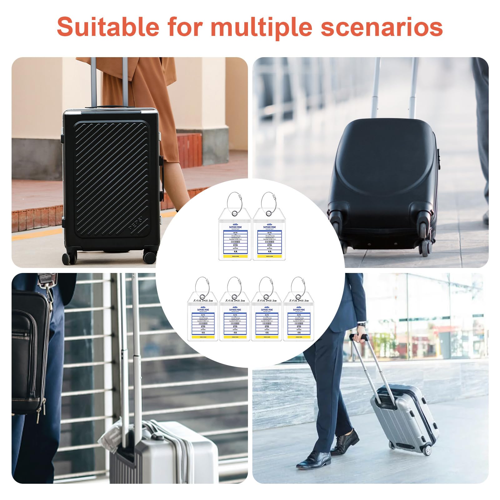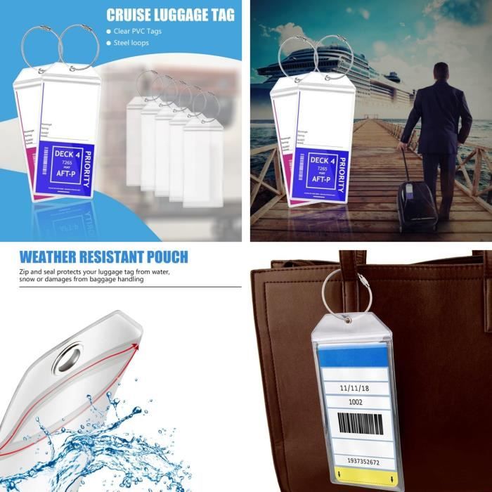 Étiquettes bagage PVC transparentes - 6 pièces, 19x6.5cm, étanches - Convient pour valises, croisières, avions Étiquette. En 1 fois 【Compatibilité 】Porte etiquette valise convient pour les voyages en croisière, avion; tous types de bagages, y compris valises, sacs à main, sacs à dos et étiquettes de bagage. étiquettes Valise Transparentes étanches Étiquettes Bagage Croisière XXL - 4 Pièces, PVC Transparent Porte-documents Voyage Imperméable Avec une étanchéité parfaite et une protection imperméable, elles protègent les documents à l'intérieur. 【Pratique et Commode 】Les étapes d'utilisation de étiquettes bagages sont simples : il suffit de la passer et de la serrer. Accessoires de voyage pratiques et commodes, ils offrent non seulement une protection supplémentaire pour votre bagage, mais facilitent également la gestion et l'identification, rendant votre voyage plus agréable Couleur bien visible pour ne pas confondre les valises à l'aéroport. Etiquette sous plastique donc ne craint pas les intempéries. Facile à poser. Utile Lot de 4 étiquettes de bagage étanches transparentes pour Elle protège fiablement les informations tout en offrant une étanchéité et une protection contre la poussière Avec une utilisation polyvalente, pratique et commode, ce sont des accessoires de voyage idéaux pour hommes et femmes 【Design Unique 】Etiquettes à bagage dispose d'une pratique fermeture scellable supérieure réutilisable, facilitant l'insertion et le retrait des documents.