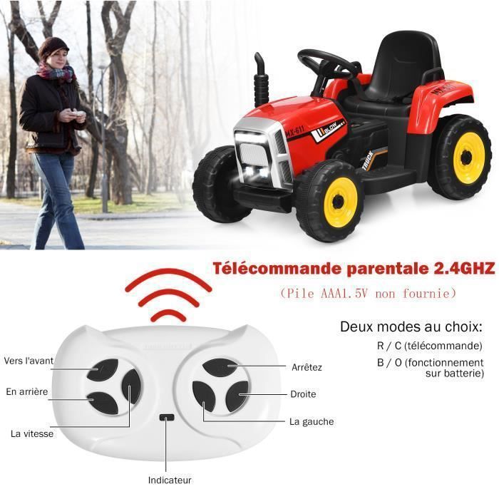 Ce véhicule électrique pour tout-petits offre un démarrage et un arrêt en douceur pour une conduite plus sûre et plus confortable. Grâce aux leviers de commande, les enfants peuvent déplacer la pelle et le godet de haut en bas, ainsi que la base du godet de gauche à droite. Le tracteur électrique pour enfants COSTWAY 12V est équipé de 6 pneus, d'une pelle et d'une remorque amovible. Il dispose de LED, de musique, d'une télécommande 2,4G et peut atteindre une vitesse de 3 à 8 km/h Alimenté par une batterie de 12 V, il roule à une vitesse de 2,5 à 3,5 km/h pendant 1 à 2 h. Il dispose d'un klaxon, de musique, d'une radio, d'un lecteur MP3 et d'une connexion sans fil pour les divertir et est livré avec une télécommande permettant aux parents de le contrôler en toute sécurité 【Roues Adaptables】Conçu pour accompagner les aventures de votre enfant, ce tracteur électrique est doté de roues résistantes à l'usure, antidérapantes et increvables. COSTWAY Caterpillar Porteur Tracteur Enfants avec Reorque Aovible 【Cadeau Exceptionnel】Deux moteurs de 28 W et une batterie rechargeable de 12 V garantissent des performances prolongées. Avec un klaxon intégré, de la musique, des lettres de l'alphabet, des contes, des lumières LED et un port MP3, cette tractopelle à pédales est un cadeau idéal pour les enfants de 3 à 8 ans. Jouet Enfant 3-8 Ans 12V 12V Tracteur Électrique Enfants Avec Pelle&Remorque Amovible Véhicule Tracteur électrique Pour plus de sécurité, les parents peuvent utiliser la télécommande avec 3 réglages de vitesse. Description du produit Description : Laissez les enfants découvrir le plaisir et développer leurs compétences avec notre tractopelle à pédales 4 en 1 ! Elle combine les rôles d'un tracteur, d'une pelleteuse, d'un bulldozer et d'une voiture.