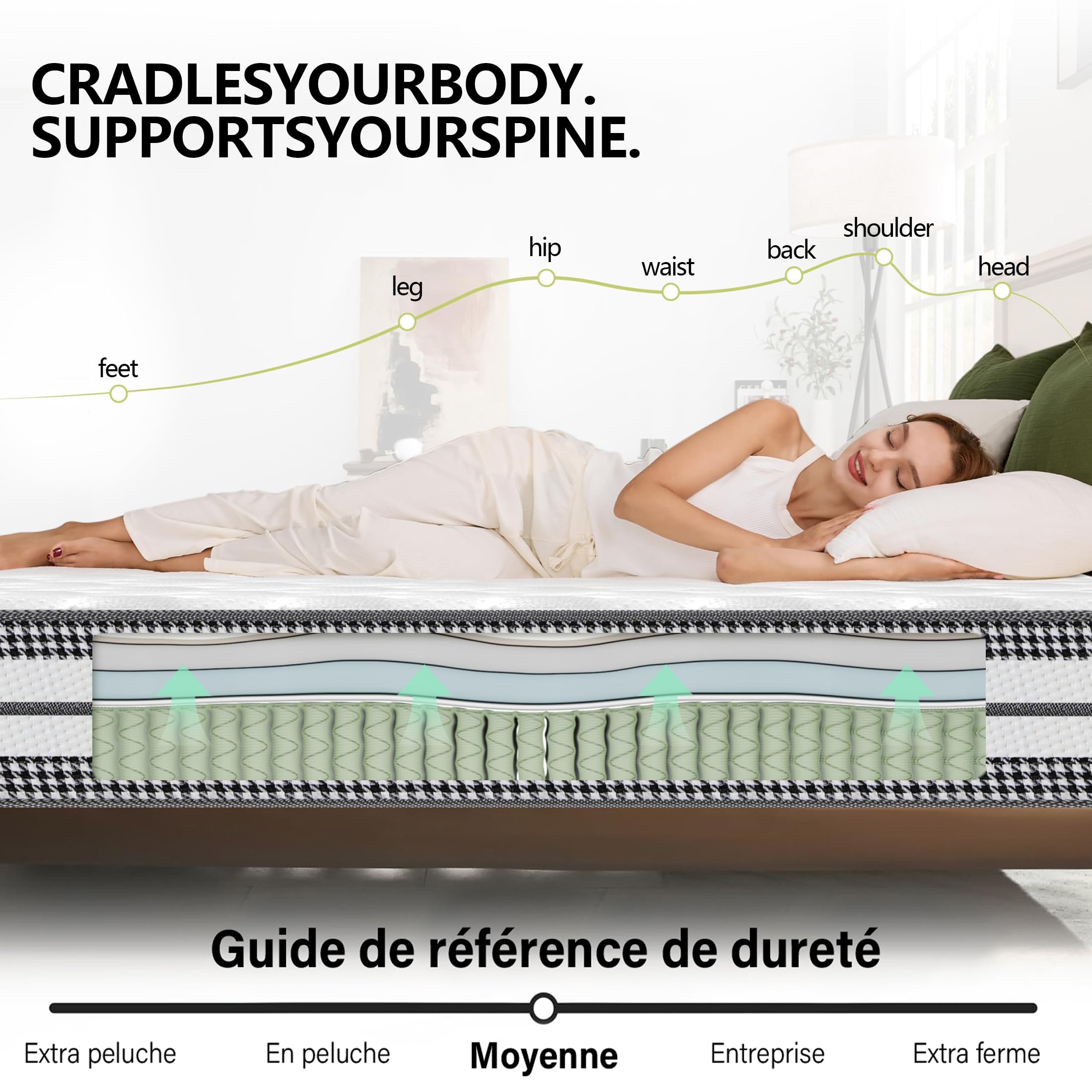 Ils sont compatibles avec tous les types de sommiers. 👌【Respirant et Hypoallergénique】Nos matelas sont certifiés OEKO-TEX et Certi-Pur. Matelas luxe hybride mémoire de forme 200x200 épais 30cm | Leroy Merlin Fabriqué à partir d’un mélange de couches de mousse à mémoire de forme gel premium et d’un tissu respirant renforcé, ce matelas offre une douceur au contact de la peau tout en garantissant une durabilité et une résistance à la déformation exceptionnelles À la réception de votre matelas, veuillez déballer soigneusement l'emballage. Matelas 90x200 cm,Épaisseur 25cm,Hybride Matelas en Mousse à Le matelas retrouvera sa forme d'origine dans les 7 secondes suivant le déballage. Veuillez le laisser reposer pendant 72 heures afin qu'il se gonfle complètement et atteigne son épaisseur idéale. Matelas Ergonomique Dos Matelas 90x200 Cm Épais 25cm, Certifié Oeko-TEX, Moyenne Matelas épais 25cm 💯【Emballage Innovant】Afin de garantir l'hygiène et de faciliter le transport, nos matelas sont emballés sous vide, pliés et roulés dans des boîtes en carton. 🛌【Soutien Ergonomique Zones】Doté d'une conception multicouche à plusieurs zones, ce matelas offre un soutien équilibré et ferme qui épouse les contours de votre corps tout en garantissant une indépendance de sommeil optimale. Son noyau de matelas innovant soulage les points de pression et isole chaque mouvement, offrant un soutien personnalisé adapté aux besoins des personnes dormant sur le dos, sur le côté ou sur le ventre.