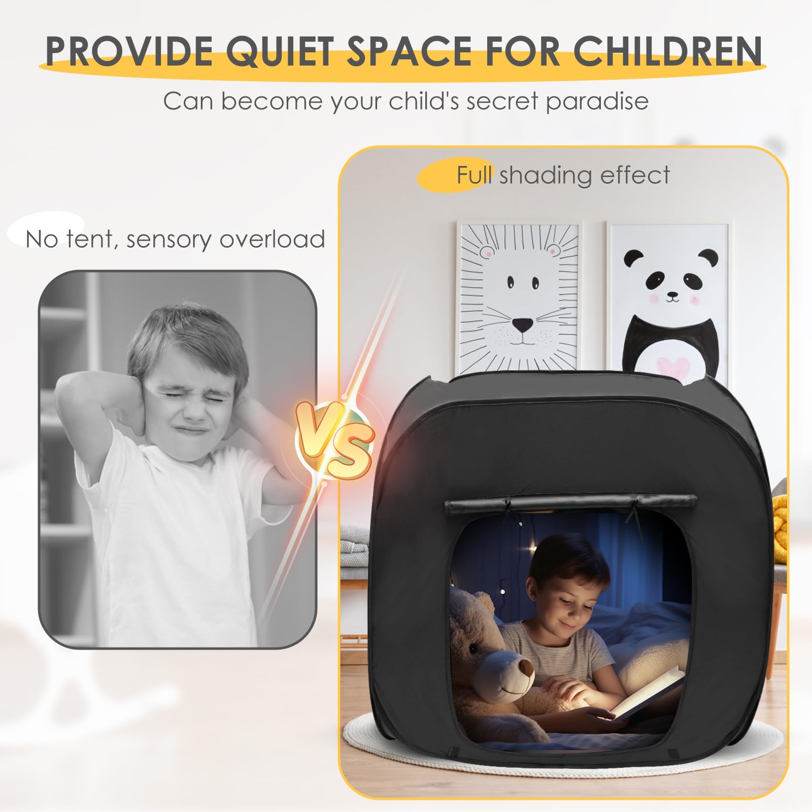 【Effet Occultant Complet】En raison de l'effet occultant de la tente sensorielle, les enfants peuvent utiliser des lampes UV, des projecteurs et d'autres jouets lumineux pour imiter diverses expériences sensorielles Tonnelle De Jardin | Tente De Jeu Pour Enfants Avec 250 Balles Bleu 120x120x90 Cm Cfw310778 93374183 Tente de jeu Pop Up noire pour projection de lumière avec sac de transport.Elle offre un espace sensoriel de détente et de calme où s'isoler. Elle permet d'utiliser un équipement UV et des objets éclairés La tente pop up à imprimé nuit étoilée crée un environnement sombre et apaisant, idéal pour les enfants d'anxiété, d'autisme ou de problèmes de concentration 【Espace Sensoriel】Le grand espace de 120 x 120 cm peut accueillir confortablement 2 à 3 personnes. Que vous recherchiez une cabane intérieure, une tente sensorielle ou un tunnel pour lit, ces tentes pop-up offrent une grande variété d'options pour répondre aux besoins des adultes et des enfants. Elles sont faciles à installer, confortables et durables, garantissant des heures de plaisir et de détente pour toute la famille Elle est également livrée avec un sac de transport pour un rangement compact et facile à transporter 【Coin Calme】Lorsque le monde devient trop lourd, notre tente sensorielle offre un sanctuaire douillet même à la lumière du jour, aidant les enfants à retrouver calme, contrôle et sérénité — parfait pour les enfants ayant des besoins sensoriels Tente Sensorielle Cossy 120cm , Pop Up Tente De Jeu Pour Tente Fille Chambre