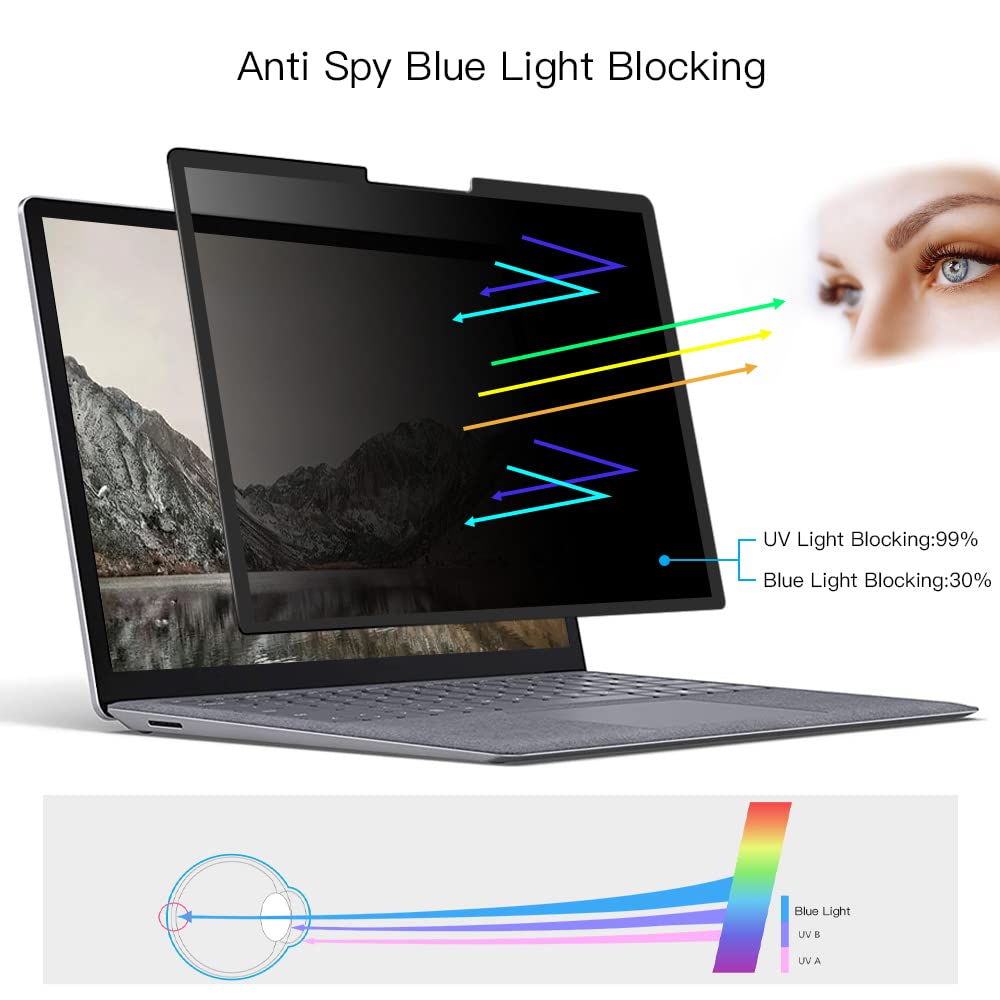 À des angles latéraux dépassant 30°, l'affichage s'assombrit, empêchant les personnes à proximité de lire vos travaux ou données personnelles. Il réduit la fatigue oculaire et offre un design lavable et réutilisable pour une utilisation durable. Qui devrait utiliser ce protecteur d'écran de confidentialité pour Microsoft Surface Laptop 13 ? Idéal pour les professionnels, les étudiants et les voyageurs travaillant dans des espaces publics. 【Protection Anti-espionnage à 30°, Clarté de Vue Frontale】Conçu pour bloquer les vues latérales au-delà de 30°, ce filtre d'écran protège les informations sensibles lors de voyages, de réunions de travail ou d'utilisations publiques tout en maintenant un affichage frontal lumineux et net. Veuillez confirmer votre modèle avant l'achat. SenseAGE Filtre de confidentialité magnétique pour ordinateur Comment cela fonctionne-t-il avec le pavé tactile, la saisie ou l'utilisation d'un stylet ? Le grip nano magnétique s'attache en quelques secondes sans bulles ni résidus. Il est réutilisable, lavable et anti-traces de doigts, permettant une saisie fluide et une écriture au stylet sans latence. Protection Anti-espionnage à 30°, Clarté de Vue Frontale]Conçu pour bloquer les vues latérales au-delà de 30°, ce filtre d'écran protège les informations sensibles lors de voyages, de réunions de travail ou d'utilisations publiques tout en maintenant un affichage frontal lumineux et net Protection Vie Privée 13.3 Pouces Anti Lumière Bleue RanBluu - Filtre Confidentialité Magnétique 13,3 - Anti-lumière Bleue - Double Face - Installation Facile Filtre Confidentialité Magnétique 13.3 Pouces Le filtre de confidentialité bloque les vues latérales, protégeant ainsi le contenu de votre écran. Le protecteur d'écran de confidentialité magnétique Nano pour Surface Laptop 13 (modèle 2025 2095) utilise une fixation magnétique pour une installation rapide. Il protège les données personnelles et confidentielles en assombrissant les côtés droit et gauche de l'écran à partir d'un angle de /- 30 degrés. Le filtre est facile à fixer et à retirer grâce à des aimants intégrés Snap-on pour la confidentialité et retirez-le à tout moment sans résidu, idéal pour le travail, l'étude ou les voyages. Est-il facile à installer ou à retirer ? Puis-je l'utiliser avec d'autres protecteurs ? Non. Conçu pour le Surface Laptop 13 2025 (Modèle 2095), ce protecteur d'écran de confidentialité bloque les vues latérales tout en gardant l'affichage frontal clair. Aide à réduire la fatigue oculaire lors d'une utilisation prolongée de l'écran—idéal pour les e-mails, les feuilles de calcul et les appels vidéo.