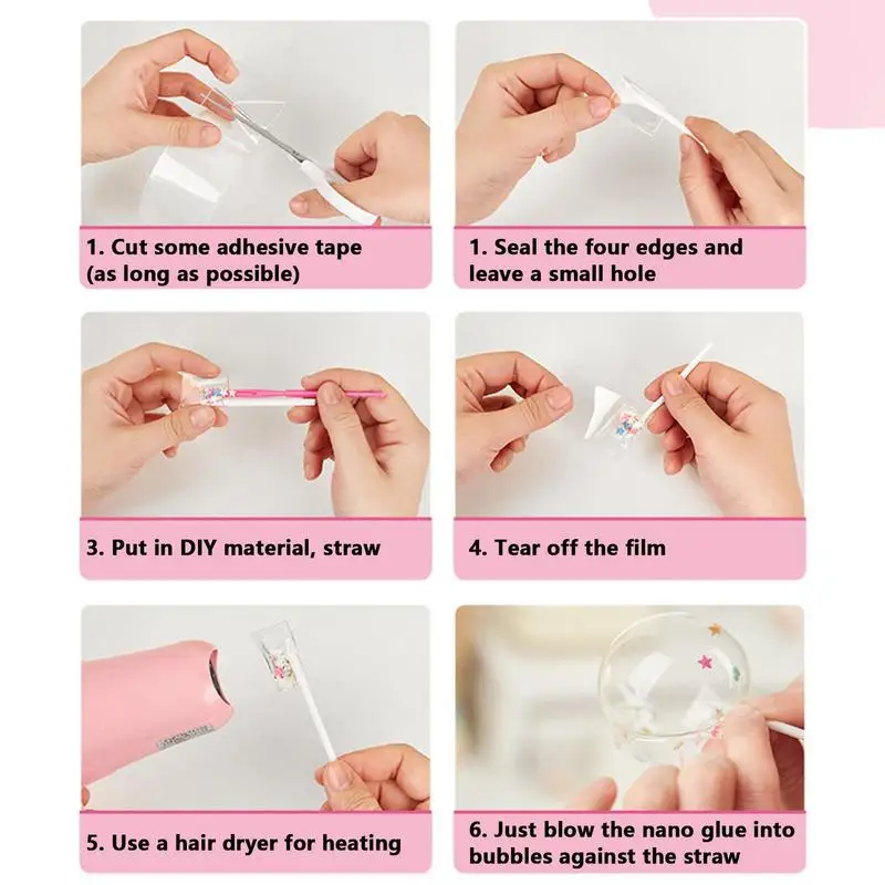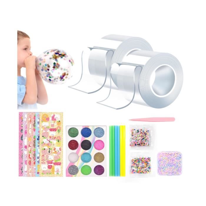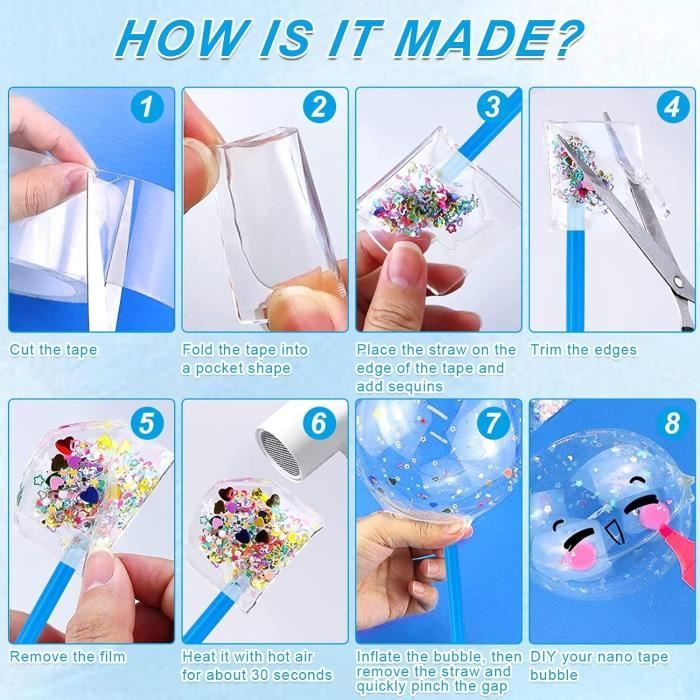 Ce kit de bulles en ruban adhésif nano peut être offert aux enfants ou à la famille comme cadeau de fête des enfants, d'anniversaire, cadeau maitresse d'école Nano Tape Supatmul Ruban Adhésif Nano à Bulles, Activité Créative à Gonfler Avec Paille, Double Face Transparent, élastique, Comme Cadeau Pour Les Fêtes, Jouet Anti-stress Loisir Creatif Enfant Ce kit de bulles Nano Tape contient une variété de paillettes et de petites boules qui vous permettent de créer des bulles Nano Tape de différentes couleurs et tailles selon vos préférences Bricolage Enfant : Créez des ruban adhésif nano à bulles de ruban adhésif de différentes formes et styles pour que les enfants puissent laisser libre cours à leur créativité. Matériau sûr : Fabriqué à partir de matériaux de haute qualité, notre ruban adhésif nano tape, durable, résistant et réutilisable. Utilisation multifonctionnelle] Ces ensembles de bulles de nano-ruban sont très faciles à transporter et à utiliser, ils conviennent donc pour jouer avec la famille, les amis et les camarades de classe à à la maison, à l'école ou au parc Vous pouvez également utiliser du ruban adhésif nano pour créer des ballons à bulles scintillants , Étapes : 1., Choisissez la longueur de ruban adhésif nano tape., 2., Ajoutez votre garniture préférée (paillettes, etc. Nano Tape Bubble Kit : Notre nano tape bubble kit, dont 2 rubans adhésifs nano (transparent)et 41 accessoires,dont des autocollants lapin,des pinces,une pompe,des paillettes, etc Vamei Nano Tape Bubbles Lot De 2 Rubans Adhésifs Nano à Bulles (3 M × 5,1 Cm) - Kit De Jouets Pour Activités De Fête Activité Créative Bulles Paillettes