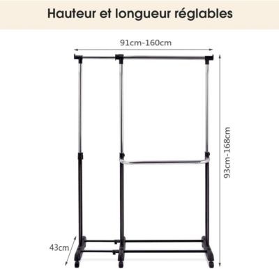 Aucun balancement, déformation ou casse. La hauteur s'adapte à chaque vêtement 2 roues avec freins : stable avec vent ou charge maximale. Gestion tellement efficace qu'elle crée instantanément de l'espace dans la chambre, la buanderie ou le cellier. On y accroche blousons moto, tenues de travail, manteaux d'hiver lourds, vestes, combinaisons de plongée et habits outdoor. Caractéristiques :Espace idéal pour les robes longues et les manteaux avec une hauteur réglable sur 2 niveauxParfait pour suspendre vos écharpes, cravates et ceintures avec 2 barres latéralesCollection magnifiquement exposée avec un porte-chaussuresHauteur de fond de 20 cm pour un espace de rangement supplémentaire pour les chaussuresCadre métallique robuste pour une forte capacité de... Portant à vêtement - VINTEKY - Double Barre - Réglable 120-200 cm Ce portant à vêtements est idéal pour les espaces restreints Dimensions du produit : 90cm W * 40cm D * 200cm H Charge maximale:200KG Couleur:Noir Idéal pour entrée, chambres, dressing, boutiques, magasins de vêtements, stands de vente, marchés aux puces et salons Organisation sans encombrement : Manteaux longs avec vestes courtes, robes avec hauts, blousons avec pantalons pliés. Porte Manteau Pour Porte Portant à Vêtement Avec Étagère De Chaussures, Penderie Vêtement Rangement Dressing Robuste Portant vêtement à roulettes | Pas cher Ce portant vêtements à roulettes propose également 2 plateaux supplémentaires pour ranger chaussures, chapeaux et accessoires. Finis les plis indésirables ! Organisation optimale sans perte d'espace Description du produit Capacité monstre, bonheur maximal 【Double capacité, espace optimisé】Ce portant vêtement solide offre le double de rangement sans prendre plus de place. 【Montage en 15 minutes sans outils】Ce portant pliable ultra-léger (7 kg) se monte seul sans outils en 15 minutes.