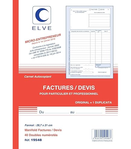 Papeterie Professionnelle Reçu Papier Carbone Triple ELVE Manifolds Factures 210x140mm - Lot De 3 Blocs 50 Feuillets Triplis Facturier 210x140mm Facture Premium Achetez ELVE Lot de 6 Manifolds autocopiant LIVRAISONS 105 x 140 A6 Horizontal 50 Dupli ELVE Manifold 'Factures', 140 x 105 mm, dupli 50 feuilles, une copie par feuille (2151) 332190500 Référence 332190500 En stock232 Produits Fiche technique Famille Registres & manifolds Couleur blanc Modèle FACTURES Sous-famille Registres & Manifolds français Format 140 X 105 MM Nombre de feuilles 2X 50 FEUILLES Références spécifiques EAN... Elve - Manifold FACTURES 105 x 140 mm 50 Feuillets Dupli Manifolds factures dupli 210 x 148 mm - par 5 | Contact RETIF