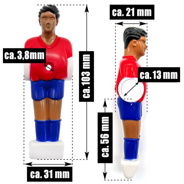 FIGURES DE BABY-FOOT EN MAILLOT NATIONALE - Qualité supérieure pour un tir précis et un plaisir de jeu maximal. 11 figurines de kicker avec des détails réalistesFigurines de baby-foot de haute qualité pour une précision de tir et un maximum de plaisir - et votre vieille table de baby-foot a l'air neuve., - Env., 10,8 x 3,5 x 2., 5 cm- Env. Résistant aux chocs et aux cassuresTrès robuste, en plastique dur - chaque figurine est équilibrée pour une précision optimale : Tous les joueurs avec une surface d'attaque du ballon renforcée au niveau du pied. Vis & écrous non inclus dans la livraison. 6,5 cm du centre de la barre au pied. Remplacement Barres 13mm Creuses Ou Pleines Jeu De Football De Table, Mini Jeux De Baby-Foot, Flipper De Football Baby Foot Enfant RÉSISTANTES AUX CHOCS ET INCASSABLES - Chaque figurine est parfaitement équilibrée. SANS MATÉRIEL DE FIXATION - Les joueurs sont fixés sur la barre avec une vis et un écrou autobloquant - ainsi la vis ne peut pas se desserrer. Livraison sans matériel de fixationLes joueurs sont fixés à la barre avec une vis et un écrou autobloquant - ainsi la vis ne peut pas se desserrer. Pour les balles de 36 mm - env. Redonnez vie à votre baby-foot avec ces figurines réalistes ! Ce set de 22 joueurs (11 par équipe) en maillots nationaux est conçu pour les barres de 13 mm. Fabriquées en plastique dur résistant aux chocs, elles offrent une précision de tir optimale grâce à leur design ergonomique 1 équipe complèteFabrication de haute qualité, design détaillé - pour des derbys émotionnels comme dans les grands clubs. 0,2 cmConseil de l'équipe eyepowerCe n'est que lorsque les vis s'adaptent parfaitement à la figurine et que les dimensions sont parfaitement assorties que vous pouvez éviter les figurines qui vacillent de manière chronique. APPROPRIE À TOUT TYPE DE JEUX - Les figurines assurent un toucher de balle direct et contrôlé dans toutes les situations. 6 cm du centre de la barre au pied. With Babyfoot By Toulet, create the foosball table that meets your desires! All our models are made in the North of France and are 100% customizable Chiffres de football Banque de photographies et d'images à haute Les figurines conviennent aux barres de football creuses et pleines, chaque figurine mesure environ 10,8 x 3,5 x 2,5 cm.