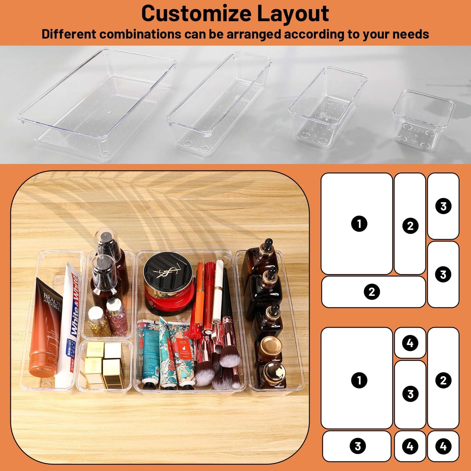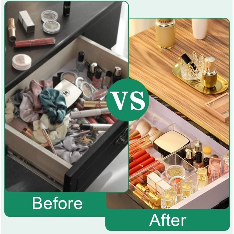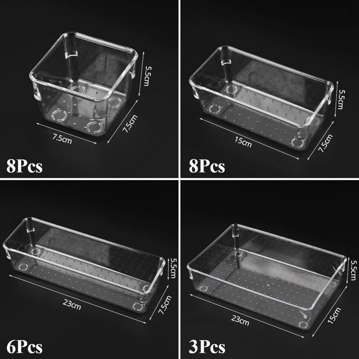 Rangement Tiroir en Plastique Transparent: organisateur de coiffeuse est équipé de 100 points antidérapants en silicone, qui peuvent être collés en bas, fixant efficacement la boîte de stockage pour empêcher le glissement. EN STOCK : Lot de 25 Organisateurs de Tiroir 4 Tailles, Rangement Tiroir en Plastique Transparent Parfait pour Salle de Bain, Coiffeuse, Bureau, Cuisine, Outils 1., Organisateurs de tiroirs en transparent est en matière de compagnie écologique pour animaux de compagnie, qui est résistante à l'impact et anti-âge, et n'est pas facile à déformer ou à s'estomper après une utilisation à long terme. Il peut être stocké de manière compacte lorsqu'il est inactif, et peut être facilement élargi lorsqu'il est utilisé, en tenant compte à la fois de la fonctionnalité et de la commodité. Conception empilable: rangement tiroir en plastique transparent adopte une conception trapézoïdale intégrée, en prenant en charge l'empilement vertical des boîtes de stockage, en économisant un espace de stockage. Combinaison flexible multi-taille: contient 25 organisateur de coiffeuse (22,7 × 15,5 × 5,5 cm, 22,7 × 7,5 × 5,5 cm, 15 × 7,5 × 5,5 cm, 7,5 × 7,5 × 5,5 cm), qui prend en charge la combinaison d'appariement gratuit pour répondre aux besoins de l'adaptation de l'espace de tiroir. Des cosmétiques à la papeterie de bureau, de la vaisselle à l'artisanat, une classification efficace peut être obtenue et l'environnement peut être maintenu propre et ordonné. Fabriqué en plastique durable et transparent, pour que vous puissiez voir ce qu'il y a dedans sans creuser ni faire de dégâts, vous aider à avoir un style de vie soigné La texture transparente et le design simple mélange pour améliorer le style visuel du tiroir ou du bureau., 2., La combinaison de jeu de 25 pièces couvre 4 tailles de grande à petite, et prend en charge l'épissage libre ou l'utilisation seul. Lntyq 4 Pcs Séparateurs De Tiroirs En Acrylique Transparent Organisateurs De Commode Extensibles Organisateur De Tiroir De Cuisine Transparent 87456901 Separateur Tiroirs HOOMOOZ Lot De 25 Organisateur De Tiroir En Plastique Transparent Kit Organisation Tiroir 25 Pièces La texture en dentelle ondulée de côté améliore encore la capacité d'appui de l'élément et empêche les petits objets de rouler et de diffuser. Par exemple, une boîte de rangement de grande taille peut stocker des ensembles de papeterie, tandis qu'une boîte de rangement de petite taille convient aux accessoires pour cheveux, aux boutons et autres articles fragmentaires. La surface est facile à nettoyer et prend en charge l'essuyage ou le lavage avec un chiffon humide, ce qui le rend facile à entretenir. Lot de 25 Organisateurs de Tiroirs en Transparent: organisateurs de tiroirs en transparent est fait de matériau pour animaux de compagnie, avec une transparence comparable au cristal, et vous pouvez rapidement localiser les éléments cibles sans fouiller. La conception transparente combine le polissage en coin arrondi lisse, en tenant compte de la pratique et de la sécurité, et convient aux scénarios d'utilisation à haute fréquence tels que la maison et le bureau.