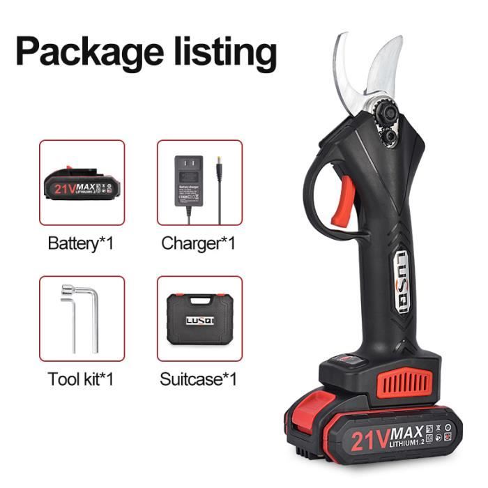 Les lames des sécateurs électriques sont tranchantes. Lames SK5, écran LCD et dissipateurs thermiques : Les lames de nos sécateurs sans balais sont fabriquées en acier SK5 à haute teneur en carbone, qui offre une excellente résistance à la rouille et à l'usure, ainsi qu'un tranchant significativement amélioré, permettant des tâches d'élagage plus rapides et plus régulières. Conception ergonomique : Les sécateurs de jardin à batterie sont dotés d'une structure légère et d'une poignée en caoutchouc antidérapante, offrant un confort accru et réduisant efficacement la fatigue des mains due à une utilisation prolongée. Avant la première utilisation, assurez-vous que les batteries sont complètement chargées ; le temps de charge est de 2 à 3 heures sundpeypro 21v secateur electrique max 45mm Lorsque le courant dépasse ces valeurs, la batterie et le sécateurs électriques sans fil s'arrêtent temporairement. Oubliez la fatigue des mains causée par la taille manuelle traditionnelle, profitez d'un jardinage sans stress et efficace, et taillez vos branches en un clin d'œil En alternant les batteries, vous prolongez non seulement le temps de travail, mais aussi la durée de vie des batteries. Nous sommes disponibles 24h/24 et 7j/7 pour répondre à vos questions et résoudre vos problèmes, afin de vous garantir un voyage agréable 2 batteries rechargeables de 2000 mAh : Notre secateur electrique sans fil est équipé de deux batteries rechargeables 21 V 2,0 Ah à grande capacité, ce qui élimine les tracas liés aux cordons encombrants et vous garantit une puissance constamment suffisante. Comparés aux moteurs à balais, nos ciseaux de jardin à batterie coupent 30 % plus vite, consomment 50 % moins d'énergie, fonctionnent 60 % plus longtemps et sont 90 % plus efficaces. En mode petit diamètre de coupe (la vitesse élevée), la capacité de coupe de 25mm est adaptée pour couper efficacement les petites branches, tandis que la capacité de coupe de 40mm est conçue pour élaguer les branches plus grosses, avec une limite maximale de 45mm. Que ce soit pour un usage personnel ou pour offrir, c'est un bon choix. N'insérez jamais vos doigts ou toute autre partie de votre corps dans la zone de coupe des sécateurs à batterie, et ne pointez jamais la lame vers d'autres personnes. Sécateur Moteur Sans Balais Batterie 2Ah TEENO Sécateur Électrique Sans Fil 21V, 1x2000 MAh Batteries Professionnel Sécateur Lame Sécateur électrique Sans Fil C'est un choix de cadeau, idéal pour les hommes, les pères, les grands-pères, les mères, les maris, les horticulteurs professionnels et les jardiniers amateurs Lorsque vous ne l'utilisez pas, fermez les lames, éteignez l'appareil et rangez-le dans un endroit hors de portée des enfants. Ils offrent une prise en main sûre et confortable, même lorsque vos mains sont humides. L'appareil ne pèse que 1,05 kg avec la batterie installée, ce qui le rend léger, portable et facile à manier d'une seule main Applications multiples : Les sécateurs de jardin à batterie ont un large éventail d'applications et peuvent être utilisés dans les jardins, les parcs, les fermes, les vergers, les serres et bien d'autres endroits. Si vous avez des questions après avoir reçu le sécateur sans fil, n'hésitez pas à nous contacter. Dissipateurs thermiques qui contribuent à maintenir son efficacité lors d'une utilisation prolongée Chaque batterie complètement chargée offre jusqu'à 4 à 6 heures d'autonomie. Sécateur électrique 350 W, sécateur sans Fil avec Batteries Li et diamètre de Coupe 0-30 mm, Interrupteur de Protection de sécurité, Ciseaux de Jardin avec Moteur sans balais Protection contre les surcharges (40 A et 65 A) : Notre moteur est équipé d'une protection contre les surcharges à 40 A, tandis que la batterie est équipée d'une protection à 65 A. Sécateur Électrique sans Fil Professionnel Ciseaux À Piles 21V,Sécateur...