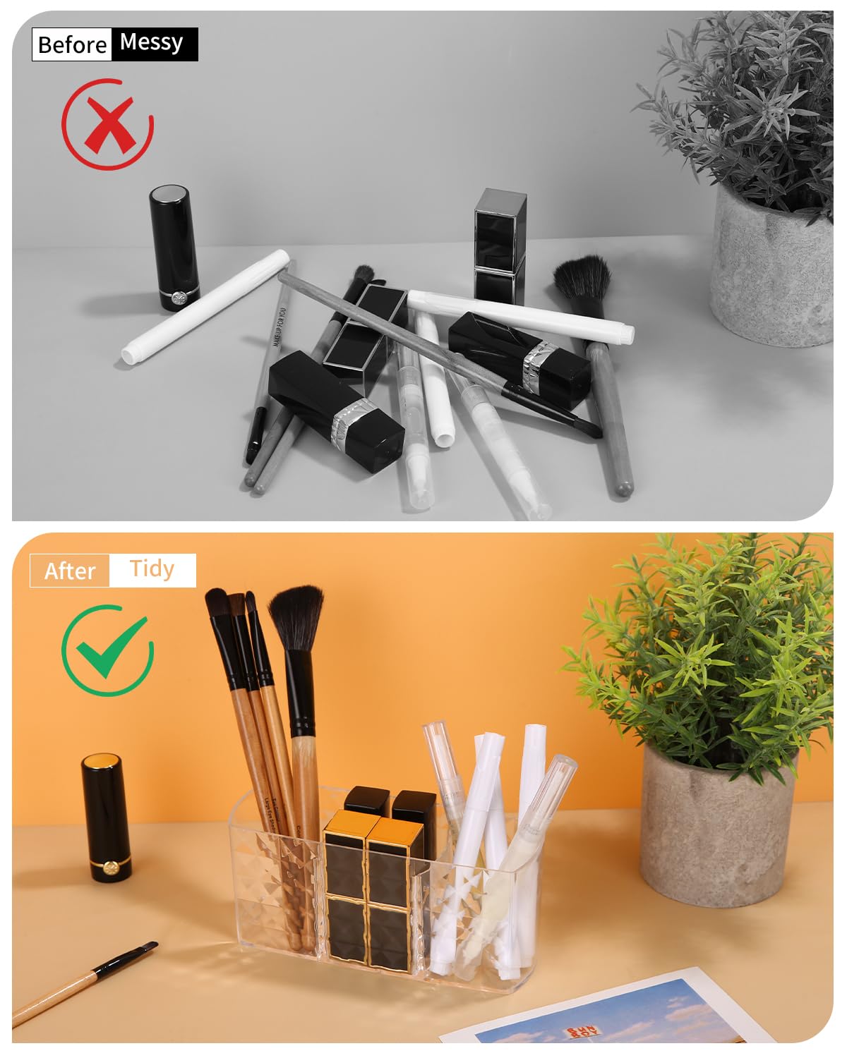 Fabriqué en acrylique robuste de haute qualité pour éviter les fissures et augmenter la robustesse Le support de pinceaux de maquillage dispose de 3 emplacements pour séparer vos pinceaux des crayons eyeliner, des points en caoutchouc sur le fond pour empêcher votre organisateur de glisser. Design élégant en noir personnellement demandé et conçu par des maquilleurs professionnels Organisateur De Porte-pinceaux à 3 Fentes, Solution De Rangement Pour Pinceaux Cosmetiques En Acrylique Noir Transparent C100818730 Prend très peu de place sur votre coiffeuse avec 3 emplacements pour séparer vos pinceaux de maquillage de vos eye-liners et crayons à lèvres Le support de pinceaux de maquillage dispose de 3 emplacements pour séparer vos pinceaux des crayons eyeliner, des points en caoutchouc sur le fond pour empêcher votre organisateur de glisser Rangement Table Coiffeuse Support De Rangement Pour Pinceaux De Maquillage 3 Compartiments En Acrylique,Noir,Vmo-011[q2044 Cuillere Doseuse En acrylique noir élégant, il a 3 compartiments pour classer tes pinceaux, eyeliners, rouges à lèvres... et même tes vernis. Mesurant 19,9x6,9x8,8cm, il prend...