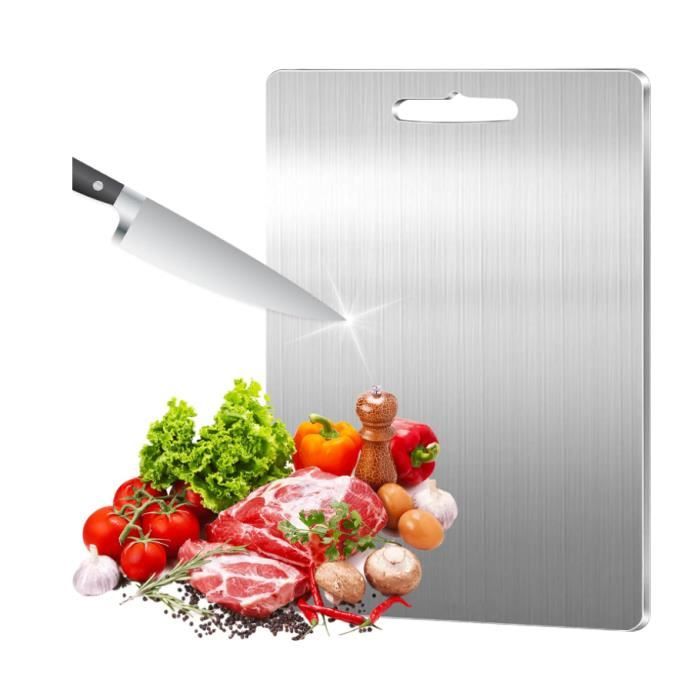 3 Pcs Planche a Découper en Titane,Planche à Découper Double Face en Titane de Qualité Alimentaire,Pour Viande,Fruits,Fromage et Légumes,Garantir le Goût Original Planches à découper en titane pour cuisine : notre planche à découper en titane, avec sa capacité de suspension, garde votre cuisine propre et organisée. Son design raffiné ajoute une touche d'élégance et assure un nettoyage facile, vous laissant un espace de cuisson impeccable et élégant Robuste et Durable : L'ensemble de planche à découper cube comprend trois tailles pratiques (20 × 29 cm, 23 × 34 cm et 28 × 39 cm), qui conviennent à une variété d'applications dans la cuisine. Qu'il s'agisse de remplir la viande ou de couper des légumes - cette planche reste non seulement stable, mais vous permet également de contrôler le total à chaque coupe, parfait pour un travail de cuisine précis. Planches à découper lavable directement au lave-vaisselle. Planche Double Face Hygiénique Planche à Découper Titanium Premium Double Face En Acier Inoxydable 304, Pour Viande, Fromage, Fruits Et Légumes (29x20cm Planche Antibactérienne Lave-vaisselle L'interface robuste en titane est antibactérienne, durable et hygiénique pour les aventures de cuisine quotidiennes et les travaux de cuisine intensifs. La planche à découper cube n'absorbe pas les résidus alimentaires et peut être rincé simplement en quelques secondes. Un chemin rapide et sans effort vers la cuisine propre et hygiénique - prêt pour la prochaine préparation sans grand effort. Resseur-lentle pour une coupe précise : Contrairement aux matériaux lisses tels que la pierre ou l'acier qui rendent vos couteaux émoussés, le titane est trois fois plus doux que l'acier. Planche Double Face Hygiénique Planche à Découper En Titane Pur - Double Face Et Lave-vaisselle Planche à Découper Titanium Cela garantit que vos lames restent tranchantes plus longtemps. Planche à découper double face, facile à nettoyer et à ranger, idéale pour diverses tâches de cuisson. Légère, fine, facile à ranger, évite la contamination croisée, ne dégage pas d'odeurs. Plus saine et plus sûre, matériaux de haute qualité, portable, rangement parfait, nombreuses utilisations