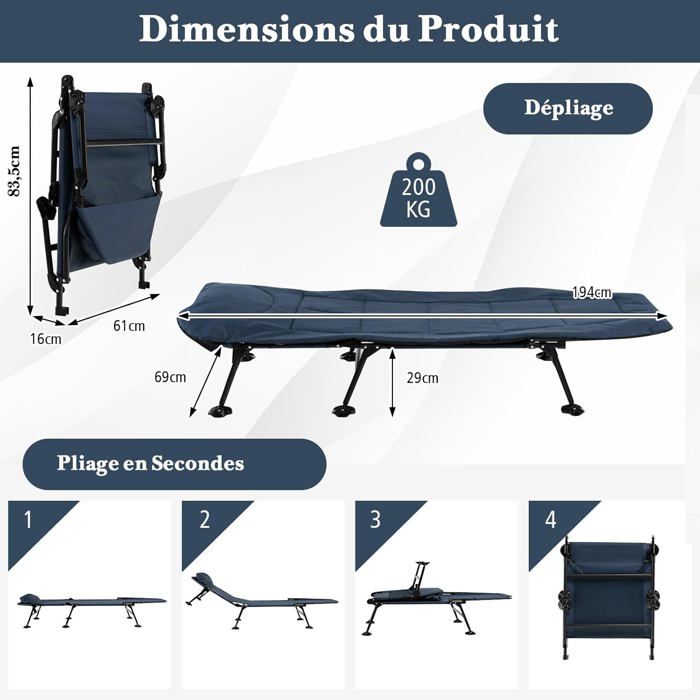 L lit d camping légr t portabl put êtr plié t déplié n qulqus sconds sans outils. Grâc à la concption pliant, vous pouvz l mttr dans la voitur ou dans l coin d la maison commodémnt Les pieds antidérapants répartissent le poids uniformément, ajoutant de la stabilité pour en faire un choix fiable comme lit pliant, lit de camping ou lit portable dans n'importe quel environnement Cadre Acier 200kg Oreiller Amovible Lit De Camping Pliable Pour Adulte - Lit De Couchage Oxford Réglable à 4 Positions - Chaise Longue Lit De Camping Decathlon Confort personnalisable avec 4 positions de réglage : cette chaise pliante offre un système de verrouillage réglable à 4 positions, vous permettant de trouver l'angle idéal pour vous détendre : asseyez-vous, inclinez-vous ou allongez-vous complètement à plat pour une expérience confortable. Que ce soit comme lit d'appoint, lit de camping, chaise longue de piscine ou sur la terrasse, ses caractéristiques adaptables apportent du confort à n'importe quel endroit. Profitez des avantages d'un lit de camping pliable qui convient à différents espaces, des camping-cars aux patios à la maison XXL lit de camp pliable pour camping - MIPAN - Avec Matelas Pochette - 190 x 71 x 35cm - Tubes métalliques - Max: 150kg - Gris · Nombre de places : 1 place ATORPOK Lit de camping pour adultes avec coussin confortable, tente Ajustez ou retirez l'oreiller pour une polyvalence maximale dans les lits de camping pour adultes Chaise longue polyvalente pour tous les environnements : avec un design de rangement pliable, ce lit de camping est parfait pour une utilisation en intérieur et en extérieur. Relaxation améliorée avec design ergonomique : conçu pour un confort équilibré, ce lit de camping dispose d'un mélange de soutien ferme et doux.