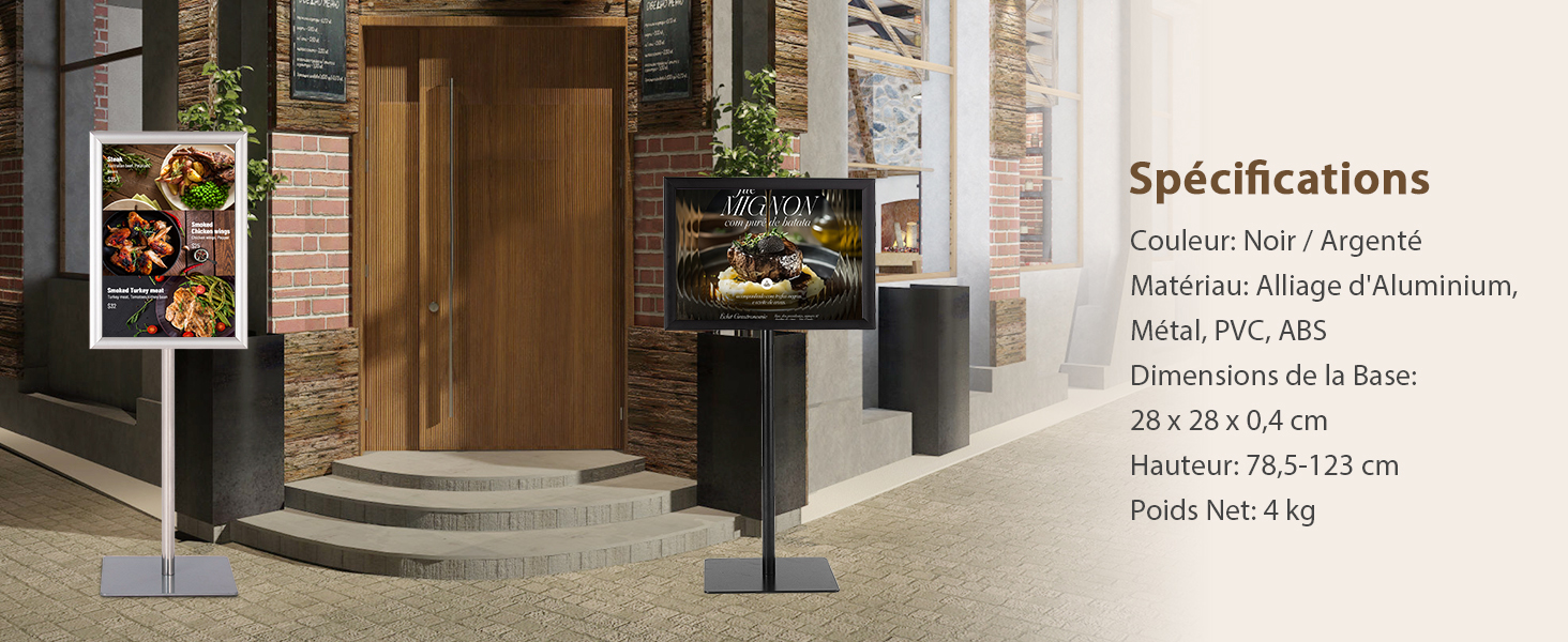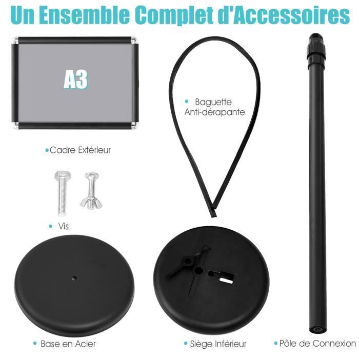 【Champ d'application large】Ce présentoir peut être utilisé dans un large éventail d'endroits, tels que des foires commerciales, des magasins de détail, des restaurants, des bureaux, des écoles, des expositions et d'autres lieux où des manifestations publiques sont organisées Remarque : Cette série est disponible en pack de 1 et 2., Argent x 2 ou Noir x 2 est un pack de 2., 【Qualité robuste】La qualité et la fiabilité des matériaux utilisés dans ce présentoir d'affiche, le cadre en alliage d'aluminium et les tubes en acier inoxydable, ainsi que d'autres matériaux utilisés, garantissent sa durabilité. 【Facilité d'utilisation】La conception de ce présentoir d'affiche est très humaine, c'est-à-dire qu'il s'agit d'un design inséré, de sorte que vous pouvez insérer l'affiche sans utiliser d'autres outils lors de l'utilisation de ce présentoir d'affiche, ce qui est très pratique à utiliser Porte Photo Sur Pied COSTWAY Porte Affiche Sur Pied A3, Présentoir Sur Pied Rotation 360 Support Affiche Pied Rotation 360 360 Degrés, Hauteur Réglable 78,5-123 cm, Cadre en Alliage d'Alu, Tube en Acier INOX, Support Affichage A3 (Argent, A3). De COSTWAY. Prix. Achat ponctuel Porte-affiche sur pied Basic | VKF Renzel BV Porte affiche sur pied A4/A3/A2 pour événement, ERP, entreprise|Prozon