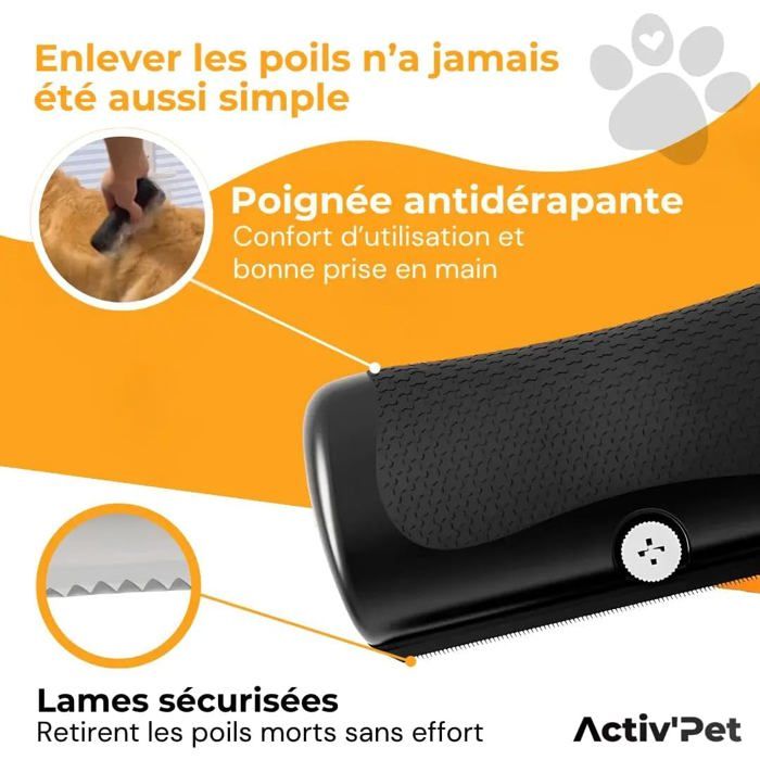 【Outil de Toilettage Efficace】 : La Brosse Sublim'Poils Activ'Pet réduit efficacement 95 % des poils, ce qui la rend idéale pour couper et éliminer l'excès de poils. 【Toilettage Facile】 : La Brosse Sublim'Poils Activ'Pet est dotée d'un manche ergonomique qui glisse en douceur sur le pelage de votre animal, offrant une expérience de toilettage douce et respectueuse de la peau. Brosse Sublime Poil Chien, Démêlage Confortable Et Efficace Pour Chiens Et Chats, Élimination Des Poils Morts(1PCS). En 1 fois. 13,99 €. 13 €99. En 4 fois Activ'Pet. Aug 22, 2025. . Essai 30 jours sans risques ... Contrairement à la majorité des brosses, la Brosse Sublim'Poils ne tire pas 【Multifonctionnelle】 : Cette brosse est l'outil idéal pour toiletter les chiens, les chats, les chevaux et les lapins ayant différents types de pelage, y compris les poils longs, les poils doubles ou les poils rêches. Brosse pour Chiens Petite ,Chats. chaton, Autonettoyante Enlèvement des Poils en Un Clic Morts et Sous-Poils La conception unique de ses dents garantit une élimination complète et sans effort des poils, laissant le pelage plus sain et plus brillant. 【Solution Pratique】 : Cette brosse compacte et portable est le choix idéal pour optimiser votre routine de soins pour animaux de compagnie. Brosse Ergonomique ABS Brosse Sublim'poils Activ'pet, Brosse Sublime Poils, Peigne Pour Toilettage Chien Sans Douleur Chaque utilisation procure une expérience agréable de soin du pelage. Grâce à son utilisation douce mais efficace, chaque séance devient un moment de massage relaxant que votre chien adorera. 【Conception Durable】 : Brosse Sublim'Poils Activ'Pet est fabriquée à partir d'un matériau ABS de haute qualité, garantissant une élimination fiable des poils et une longue durée de vie.