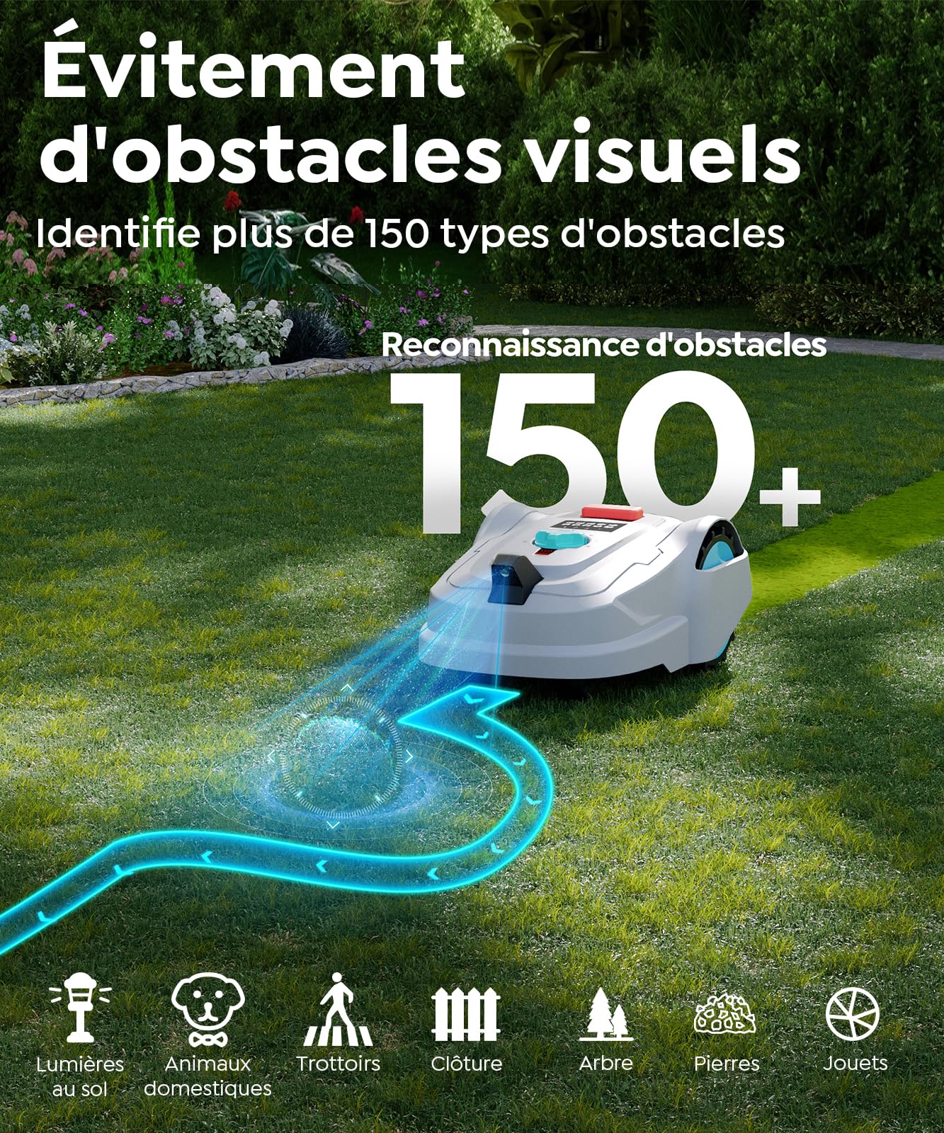 【Évitement intelligent des obstacles par IA】Le robot tondeuse sans fil Équipée d'une caméra grand angle de 135° et d'un algorithme avancé de reconnaissance par IA, elle détecte en temps réel plus de 150 obstacles courants tels que les jouets, les pots de fleurs évite les collisions avec les objets et les animaux domestiques et maintient une distance de sécurité tout en tondant l'herbe sans interruption. 【Capacité de coupe puissante】Le robot tondeuse sans Fil Périphérique moteur haute performance intégré, avec hauteur de coupe réglable (2 à 6 cm) et largeur de coupe de 18 cm, offre une capacité de coupe stable et puissante. Robot tondeuse sans fil périphérique : Réductions, Comparatif, meilleur prix Le robot YARDCARE M800Plus arrive avec une promesse forte : s’affranchir de ces limites grâce à sa vision par intelligence artificielle et sa tonte organisée par GPS. Dès la réception du colis, le YARDCARE M800Plus impose une certaine présence Remarque : Si l'herbe mesure plus de 6,5 cm, la tondeuse peut la considérer comme un obstacle. robot tondeuse sans fil X3 Sunseeker avec IA 【Protections de sécurité multiples】Le robot tondeuse à gazon avec un niveau de bruit inférieur à 60 décibels est équipé d'un capteur d'inclinaison, d'un système de détection de collision et d'un bouton d'arrêt d'urgence pour garantir que la machine s'arrête immédiatement dans des situations anormales telles que le levage ou la collision, assurant la sécurité de votre famille et de vos animaux de compagnie, vous permettant de tondre la pelouse en toute tranquillité. 【Couverture plus complète】La tondeuses robot M800Plus effectue 40 minutes de tonte régulière, puis 60 minutes de tonte aléatoire pour combler les espaces vides, en alternant intelligemment entre coupe verticale et horizontale. Robot Tondeuse Mammotion Robot Tondeuse Sans Fil Périphérique GPS - La Boutique De La Domotique Robot Tondeuse 800 M² YARDCARE 【Télécommande intelligente par application】Tondeuse gazon robot Avec APP YARDCARE, vous pouvez définir le programme de tonte, basculer entre trois modes de fonctionnement (ordonné, aléatoire, en spirale), recevoir des alertes d'état ou mettre à niveau le système à tout moment. 【GPS & Navigation Visuelle Double】La robot tondeuse sans fil YARDCARE M800Pus est équipée d'un système GPS amélioré et d'une technologie de navigation visuelle IA, qui identifie automatiquement les zones non gazonnées et les contours des bordures, facilitant ainsi le démarrage, même sans limites, et permettant une tonte précise. Les jardiniers débutants comme les experts peuvent l'utiliser sans effort et profiter d'une expérience de tonte libre et intelligente dès le premier jour.