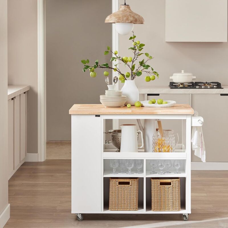 En matériau robuste avec plaque à motif bois naturel et boutons en alliage, il offre un vaste rangement (portes, supports torchons, collations) et se déplace facilement grâce à ses 5 roulettes 360° (2 avec freins), idéal pour optimiser l'espace en cuisine ou salle à manger. Ce meuble de cuisine extra stable vous offre de grand espace de rangement pour divers ustensiles dans la cuisine, à la salle à manger, etc. Avec un grand plan de travail et un petit rabattable, 2 tiroirs, 4 portes, 2 grandes armoires de 2 étages et 1 porte-torchon Veuillez faire preuve de patience et vérifier que tous les accessoires sont complets avant de procéder à l'assemblage. Il est doté d'un support de torchon en chêne et d'une décoration en fer en forme de X, ajoutant une touche unique et élégante à votre cuisine tout en soulignant sa stabilité et sa beauté. Mobilité optimale et manœuvrabilité : Doté de roulettes pivotantes à 360 degrés, dont 2 avec freins et 3 sans freins, ce chariot peut être facilement déplacé dans toutes les directions. Buffet Mobile 2 Tiroirs Desserte Cuisine Avec Roulettes PUGSDRLY - Table Pliable - 2 Tiroirs Et 2 Portes - Rangement Multifonction - Blanc - 128x71x93cm Ilot Central Cuisine Avec Rangement Et Plan De Travail Son plateau pliant s'étend jusqu'à 70 cm, le transformant en un grand espace de repas, idéal pour une salle à manger ou une cuisine spacieuse. Espace de rangement polyvalent et généreux : Ce chariot offre un espace de rangement spacieux pour tous vos ustensiles de cuisine, y compris casseroles, poêles, ingrédients et épices. La porte contient un support de collations en fer et un support latéral pour torchons, fournissant une fonctionnalité supplémentaire pour organiser efficacement votre espace de cuisine. Matériaux robustes et durables : La surface de la table est faite d'une plaque dense avec un motif de bois naturel, résistante aux usures quotidiennes et adaptée à toutes sortes de tâches culinaires comme le découpage des légumes ou la préparation des repas. KOMHTOM Meuble de Rangement en Blanc/Gris/Bleu - Desserte avec Plan de Travail Pliant, Roulettes et Pieds de Rechange en Bois pour Cuisine (Bleu Le design élégant et ergonomique du bouton en alliage de zinc facilite l'ouverture et l'utilisation quotidienne. Son format équilibré permet une intégration facile, tout en maximisant la surface utile pour préparer les repas ou accueillir plusieurs personnes. Grand...