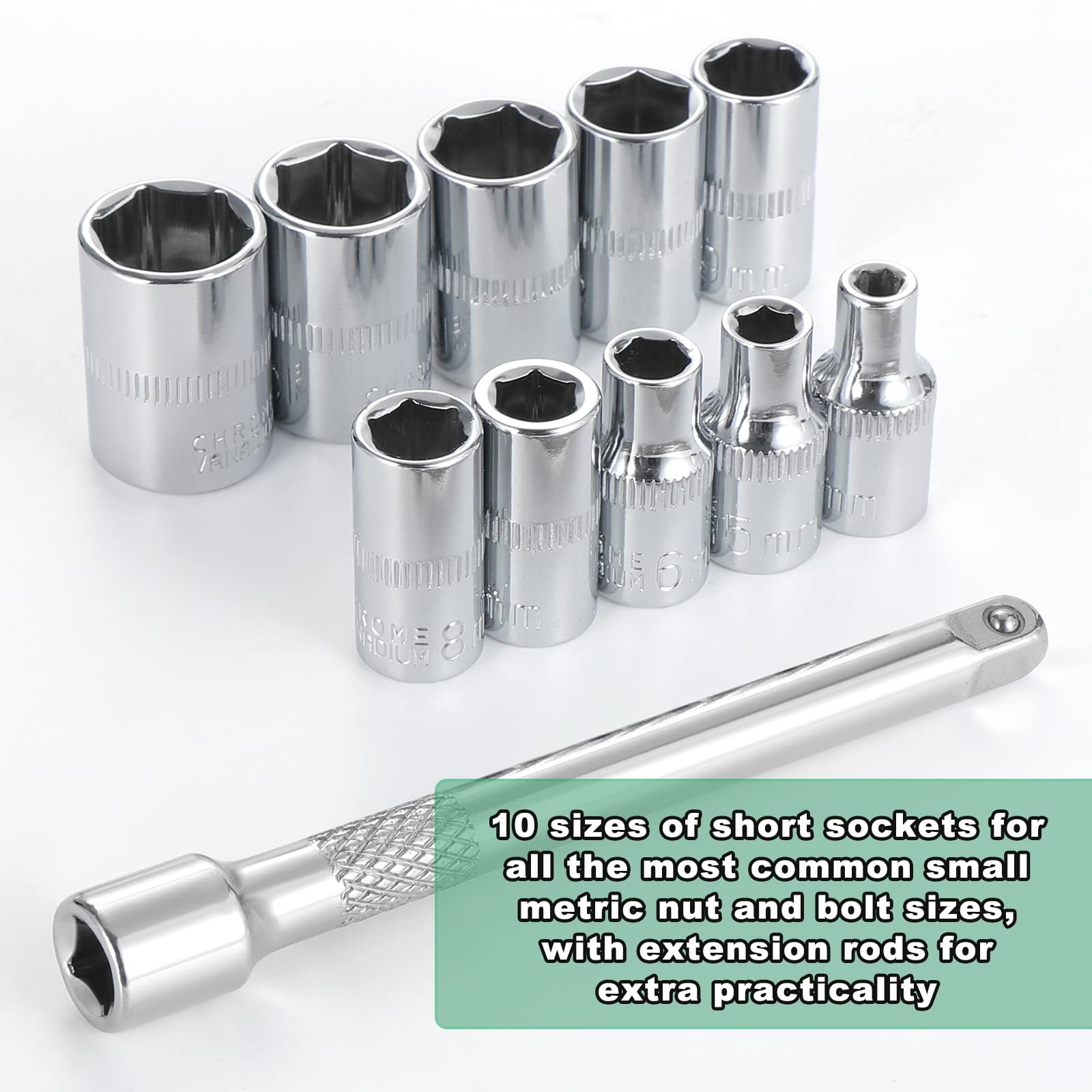 Achat sur internet Jeu de douilles chez AUTODOC Jeu De 12 Clés à Cliquet 6,35 Mm, Kit D'outils De Mécanicien Et Douilles Avec Poignée à Cliquet Réversible à Dégagement Rapide Et Barre D'extension Lot de 46 clés à cliquet 6,35 mm et douilles avec étui de rangement pour projets de réparation à la maison, en voiture et automobile Vous obtiendrez 10 douilles courtes (4 5 6 7 8 9 10 11 12 13 mm), 1 clé à cliquet 1/4 (6,3 mm), 1 interface de tige étendue de 6,3 mm. Avec clé à double extrémité La surface est galvanisée, et la durée de vie est longue
