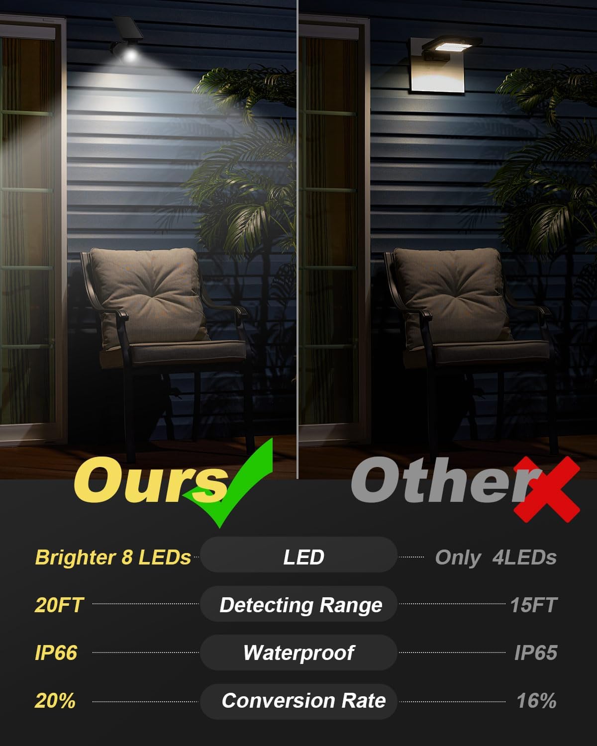 Commutateur de lumière intelligent: ce Lumiere Solaire Exterieur construit dans le commutateur de lumière, la première utilisation nécessite l'ouverture manuelle du commutateur de lumière, la lumière passera par l'induction intelligente de la luminosité ambiante, automatiquement en mode de charge pendant la journée, Allumez la lumière la nuit, pas besoin d'utiliser manuellement ou à l'aide d'une télécommande Description du produit: Caractéristiques: Détection rapide dans la gamme grand angle de 10 mètres 120 °, hauteur d'installation recommandée dans les 2,5 mètres Trois modes d'éclairage: 1., Lorsque la personne est proche, Allumez la lumière pendant 30 secondes, éteignez la lumière lorsque vous quittez; 2., La lampe reste toujours allumée avec une luminosité de 30%, la luminosité devient 100% lorsque la personne s'approche et revient automatiquement à 30% de luminosité lorsqu'elle part; 3., La lampe reste normalement allumée avec une luminosité de 30% (pas d'induction à ce stade) Interrupteur photosensible intégré, la première utilisation nécessite l'ouverture manuelle de l'interrupteur photosensible, la lampe passera par une induction intelligente de la luminosité ambiante, entrera automatiquement en mode de charge pendant la journée, Allumez la lampe la nuit, pas besoin d'être actionné manuellement ou à l'aide d'une télécommande Soutenir le réglage de 120 ° vers le haut et vers le bas, le pliage maximal peut réaliser le panneau coïncidant avec le mur, pratique et beau Conception de boîtier étanche extérieur professionnel de classe ipx45, taux de conversion 93% panneau solaire en silicium cristallin élevé, dans des conditions de lumière abondante, 5 - 8 heures peuvent être complètement chargées, pour atteindre environ 36 heures d'éclairage, les jours nuageux et pluvieux peuvent également être éclairés 2 - 3 nuits Spécifications: Nom du produit: lampe solaire extérieur protecteur de mouvement Couleur: noir Taille: 11 * 12 * 2., 5cm Matériel: ABS Nombre de perles de lampe: 32led Luminosité d'éclairage: 350 - 470 Lumens Température de couleur: 5500k Classe imperméable à l'eau: ipx45 Puissance nominale: 5 (w) Tension: 12 (v) Plage d'induction: 10 mètres 120° Hauteur d'installation: à moins de 2,5 mètres du sol Le paquet contient: 1 x lampe solaire extérieur protecteur de mouvement Réglable de 120° vers le haut et vers le bas: Cette Applique Murale à Détecteur de Mouvement prend en charge le réglage de 120° vers le haut et vers le bas, ce qui facilite le réglage flexible de l'éclairage de près ou de loin en fonction des besoins de la plage d'éclairage, et le pliage maximal permet au panneau de coïncider avec le mur, pratique et esthétique Projecteur Extérieur Détecteur de Mouvement, 35W 2800LM Triple Spot LED Lampe solaire étanche professionnelle de classe ipx45: Cette Lumiere Etanche Spot Solaire est conçue avec un boîtier étanche extérieur professionnel de classe ipx45, peut faire face à toutes sortes de mauvais temps, avec un taux de conversion de 93% panneau solaire en silicium haute cristalline, dans des conditions de lumière abondante, peut être complètement chargée en 5 - 8 heures, réalise environ 36 heures d'éclairage, les jours pluvieux puvent également être éclairés 2 - 3 nuits Orientation verticale à 120° : Cette applique murale à détecteur de mouvement permet un réglage vertical à 120°, permettant un réglage flexible de l'éclairage, de près comme de loin, selon vos besoins éclairage Extérieur Solaire Autonome Lampes Solaires D'extérieur à Détecteur De Mouvement, 120 Lampes Solaires LED à 3 Modes, Angle D Lampe Solaire Extérieure Avec Détecteur PHARE LAMPADAIRE PANNEAU SOLAIRE PHOTOVOLTAÏQUE DÉTECTEUR DE MOUVEMENT...
