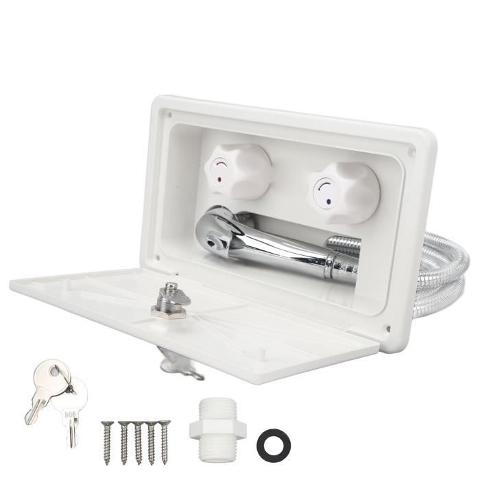 Kit de douche extérieur résistant aux intepéries pour caping-car Fonction pratique]: La salle de douche extérieure dispose d'un interrupteur d'eau chaude et froide intégré. Vous pouvez facilement sélectionner la température de l'eau souhaitée. Équipée de deux clés, la salle de douche peut être fermée en toute sécurité lorsqu'elle n'est pas applicable L'unité de douche extérieure est parfaite pour une utilisation en voyage. Qualité Premium] La cabine de douche est fabriquée en ABS et en acier inoxydable de haute qualité, résistant à l'usure et à la durabilité. Équipée de deux... Douche Extérieure Camping-car Commutateur Eau Chaude Froide Acier Inox Boîte De Douche Extérieure Pour Camping-car Avec Interrupteur Eau Chaude/froide - Équipement Caravane Et Bateau Accessoire Camping-car Caravane Le réglage de l'eau chaude et froide est contrôlé par un bouton et est facile à utiliser.