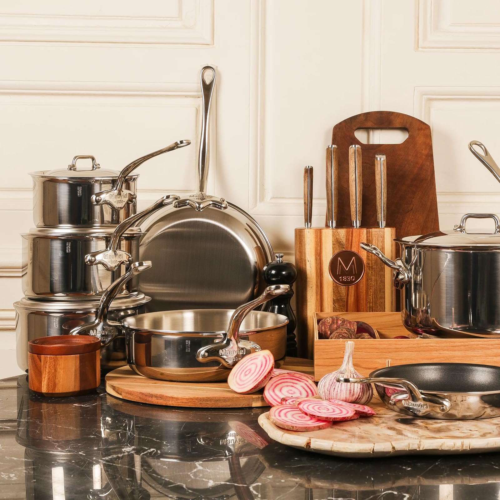 La gamme utilise un matériau 5 couches : l’inox acier multi couches. Mauviel1830 - M'Cook 521330 - Poêle inox - 30 cm - Maison 521028 de la collection M'COOK. Pour redonner de la brillance à vos ustensiles de cuisson en inox, utilisez la pâte d’entretien Inobrill. Entretien : choisir une éponge abrasive pour tous les supports inox, ne pas utiliser de limaille de fer, préférer une éponge non abrasive pour tous les revêtements anti-adhésifs. Cette collection est disponible avec la monture fonte d'inox, la monture bronze et la monture finition fonte par électrolyse., Diamètre : 28 cm , Capacité : 6,6 litres Matière : Inox multi-couches Casserole Mauviel inox monture fonte d'inox laquée noire | Boutique... La casserole M'COOK diamètre 28 cm possède une anse face à la queue, pour une meilleure prise en main. Collection M'Cook de Mauviel : L'Excellence Française en Cuisine Sauteuse Acier Inoxydable Mauviel1830 - M'Héritage 650128 - Casserole - 28 Cm Mauviel M Cook Stainless Steel Cet alliage permet une répartition optimisée de la chaleur sur toute la surface du produit, un gain de temps, ainsi qu’une économie d’énergie. C'est donc avec le plus grand soin que la maison Mauviel1830 a conçu ses lignes de casseroles, avec une attention particulière à la conductibilité thermique et à la durabilité. Les casseroles Mauviel1830 résistent à l'épreuve du temps en conservant leurs performances culinaires : à avoir absolument dans ses placards ! Généralement utilisée pour cuire dans de grands volumes d'eau, des recettes à base de liquides, la casserole est également utilisée pour cuire des viandes, des sauces ., ., ., Elle est de tous les usages. Cette collection spécialement conçue pour s’adapter aux nouvelles techniques de cuisson comme l’induction reste aujourd’hui une référence pour les professionnels de la restauration mais également pour les chefs du quotidien, du fait de son usage polyvalent et d’excellentes performances de cuisson.