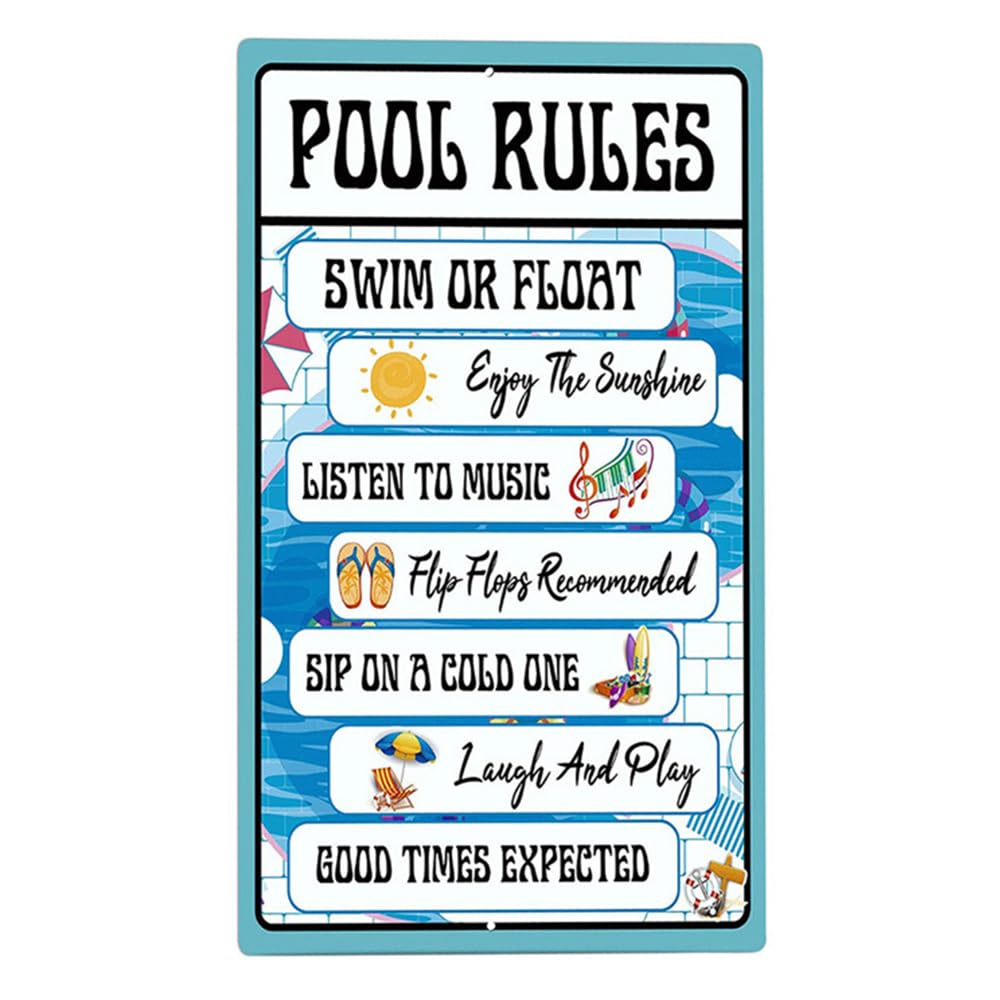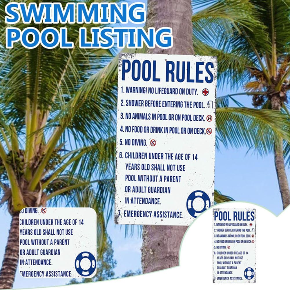 Caractéristiques : Nom: Panneau et règle de piscine extérieure et intérieure Matériau : fer., Dimensions : 30 x 20 cm., Poids : 205 g. Série horizontale disponible en quatre modèles, qui sont Y001, Y005, Y013 et Y023., Série verticale disponible en six modèles, qui sont Y003, Y004, Y007, Y009, Y010 et Y012, qui peuvent répondre à vos différents besoins. Nombreuses utilisations : grâce aux couleurs vives et au texte du panneau décoratif pour l'extérieur et l'intérieur, il est parfait non seulement pour une utilisation en extérieur comme panneau d'avertissement pour les lacs, les rivières, les ruisseaux, les étangs à poissons, etc. Facile à lire : le panneau « Pool Rules - Swim at Your Own Risk » est fabriqué avec une impression de haute qualité, assurant des lettres claires et lisibles. Durable : les panneaux et règles de piscine extérieure sont fabriqués en feuilles de fer de haute qualité, résistantes à la corrosion, à la pression, pas faciles à plier pour une utilisation à long terme. Signes d'avertissement de vecteur de piscine publique. Icônes des Le texte et les couleurs sont clairs et lumineux, et le motif vif le rend instantanément reconnaissable, assurant qu'il ne sera pas ignoré et sert de réveil efficace. Le style vintage et mignon de la plaque améliore son attrait visuel. Il est adapté pour la décoration extérieure de piscine, parc aquatique, lac. Design rétro, créatif et exquis : la plaque en métal est... Panneau Piscine Métal Règles Panneau En Métal D'avertissement De Piscine, Panneau En Métal Panneau Piscine Métal Règles Sécurité mais également pour une utilisation en intérieur comme panneau d'avertissement pour les piscines ou les cours, où le style vintage et mignon du panneau le rend plus agréable à regarder. Design : avec son design rétro et simple, la plaque en métal pour l'extérieur et l'intérieur peut être parfaitement adaptée à un environnement extérieur ou intérieur. Panneau qui indique le règlement intérieur de la piscine avec des pictogrammes : interdiction de fumer, interdit aux chiens, chaussures interdites Le texte et la couleur sont clairs et lumineux, et le motif vif le rend instantanément reconnaissable, ne l'ignorera pas, ce qui le rend parfait comme réveil. Forte praticité : avec son design rétro et simple, le panneau métallique extérieur et intérieur peut parfaitement se fondre dans n'importe quel environnement extérieur ou intérieur. Caractéristiques : Facile à installer : les panneaux et règles de piscine extérieure sont livrés avec un trou de montage de chaque côté qui peut être facilement installé avec des clous, des vis ou du ruban adhésif en mousse double face, ce qui est simple. Panneau optionnel : taille : 30 x 20 cm.