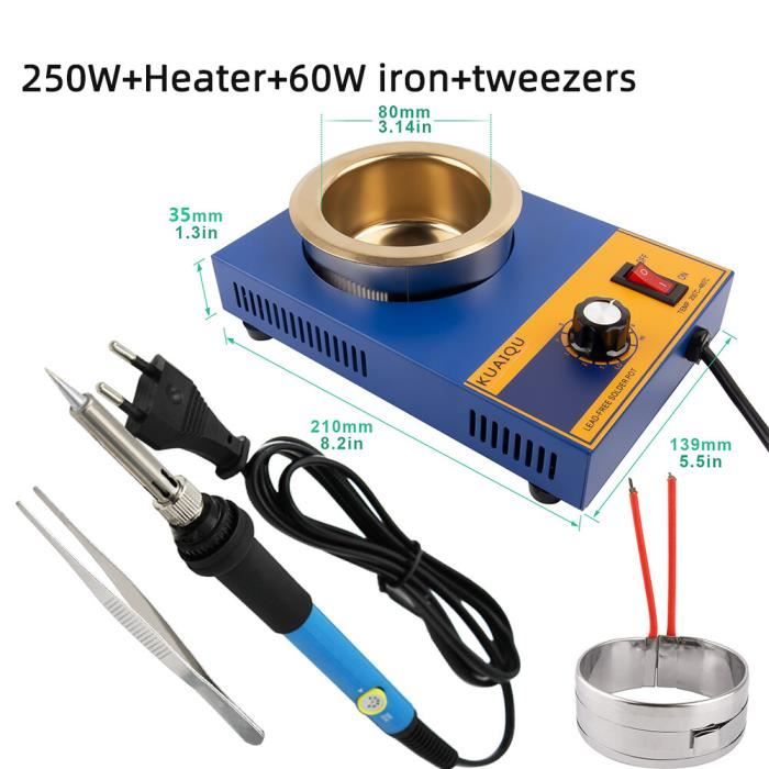 Technologie d'isolation efficace for raccourcir le temps de de l'étain, améliorer l'efficacité thermique et réduire la consommation d'énergie. Spécification:Modèle: ST-21CPuissance: 150WTempérature: 200-450Temps de : 5-15minCapacité: 500gDiamètre du pot: 50mmEmballage inclus:1x bain à dessouder à souder Beau design, plus fiable et pratique. Outil Dessoudage électronique 21B-160W - Pot à Souder à Température Réglable, Poêle à étain, Four De Pot Dessoudage électronique Portable Poste a souder,Pot à souder en étain,220V,300W,thermorégulation,bain à EJ.life bain à dessouder à souder Bain de dessoudage de pot de soudure... Avis clients Versez un peu de flux dans un autre récipient (afin que la patte de soudure puisse être touchée) Lors du soudage, placez d'abord le pied de soudage dans le flux, puis placez-le dans le four à étain for le soudage par immersion Creuset de soudage, 150 W/200 W/250 W/300 W avec capacité de