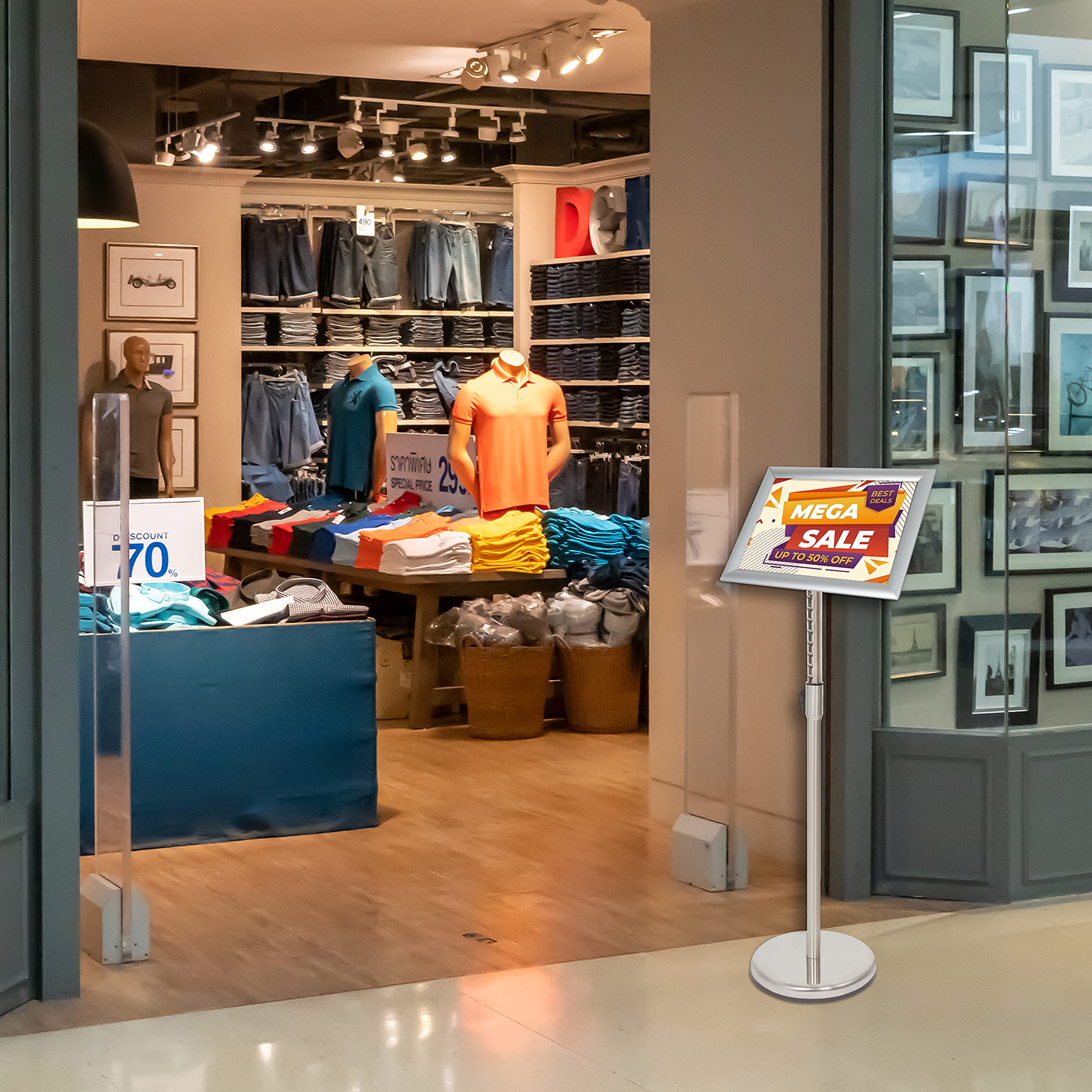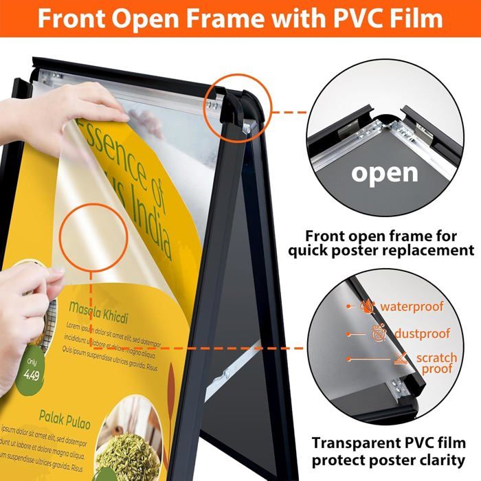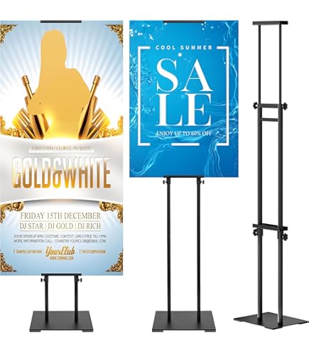 Fonctionne comme support de panneau de bienvenue, support d'affiche ou support de panneau promotionnel Service client réactif : l'équipe après-vente VAIIGO répond dans les 24 heures pour vous aider avec votre support de panneau, assurant que votre affichage reste en excellent état Format de l'affiche : A4 ou A3., A4 Hauteur : 109 cm à 141 cm. Chevalet De Peintre, Réglable En Hauteur Stand Portable Présentoir En Toile for Affiche Studio... Présentoir polyvalent : utilisation polyvalente dans les magasins de détail, restaurants, bureaux, hôtels, écoles, foires commerciales, églises, marchés agricoles, mariages et fêtes. Diamètre de la base : 25 cm. Large compatibilité : utilisation comme support de menu, panneau de bienvenue, affichage promotionnel, rappel d'avertissement, avis et instructions dans les restaurants, magasins, bureaux, écoles, hôtels, événements et marchés fermiers locaux. Support réglable : la hauteur du support A4 peut être ajustée de 81 cm à 125 cm. L'angle du cadre peut être tourné à 360 °, ce qui est très flexible 1 housse en PVC anti-reflets. Base stable à remplir : base en métal avec caoutchouc antidérapant pour éviter de glisser. Affiche à changement rapide et facile : dispose d'un cadre à ouverture frontale pour des échanges rapides et sans outils – parfait pour les stands de signalisation d'entreprise, les supports d'affichage de bureau, les stands de menu de restaurant, les affichages promotionnels et les publicités de vente au détail. Support de panneau réglable : le support d'affiche VAIIGO A4 s'ajuste de 109 cm à 141 cm avec rotation à 360° et rabat à 180° pour une visualisation multi-angle optimale. Housse de protection en PVC anti-reflet : comprend un manchon en PVC antireflet qui protège contre la poussière, les rayures et les traces de doigts tout en minimisant la réflexion de la lumière. Caractéristiques : Couleur : noir/argenté. 1 bande de caoutchouc antidérapante., 1 lot de vis. Sonew Présentoir d'affiche A4 A4 Snap Frame Display Floor Stand Board Poster Sign Menu Cadre de Couverture en PVC anti-reflet : protège les panneaux de la poussière, des rayures et de l'éblouissement à l'intérieur ou à l'extérieur et reste clair tout le temps. 1 base métallique à remplir., 1 bouteille d'eau. Base de piédestal remplissable : support de panneau au sol équipé d'une base en métal, de bandes en caoutchouc antidérapantes et d'une base remplissable (ajouter de l'eau ou du sable) pour une meilleure prise en main et une protection du sol. Matériaux : aluminium et acier inoxydable. Porte Affiche A4 VAIIGO Support Robuste Pour Affiche, Menu, Affichage Réglable Avec Base En Fonte Pour Affiche, Menu, Annonces, Vente, Avis, Affichage De Signalisation (A3, Argenté Cadre à Pression Rapide A3 Hauteur : 115 cm à 147 cm. Changement rapide d'affiche sans outil : le cadre à pression ouvert sur le devant permet de changer d'affiche en quelques secondes. Il maintient en toute sécurité les affiches en orientation paysage et portrait