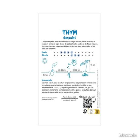 Le Thymus serpyllum est une plante incontournable pour les jardins secs et naturels, alliant beauté, parfum et robustesse. 🌸 Nom français : Thym serpolet, Thym sauvage., 🛠️ Culture et entretien. 📅 Semis : Mars à mai, directement en pleine terre ou sous abri. 🌸 Décoration : Idéal pour rocailles, bordures, talus et jardinières. Creeping Thym Serpolet D'Herbes, Facile Culture 1000 – Graines Par 🌿 Nom botanique : Thymus serpyllum. ❄️ Hiver : Résiste très bien au froid jusqu’à -15 °C., 📦 Utilisation et atouts. Sa floraison estivale attire les abeilles et les papillons, faisant du serpolet un excellent choix pour un jardin mellifère et rustique. ☀️ Il aime le plein soleil et les sols secs et drainants. 📅 Printemps : Semis et plantation. Thym serpolet : La pépinière vous propose d'acheter en ligne des Thym serpolet moins chers. Le Thym serpolet est une variété rampante qui est utilisée en cuisine dans les bouquets garnis ✂️ Entretien : Tailler légèrement après la floraison pour garder un port compact et stimuler la repousse., 🗓️ Calendrier de culture. 🐝 Attire abeilles et papillons tout l’été. 1000 pièces Thym Serpolet Couvre Sol, Graines de Thym Rampant, de... 🌱 Type : Plante vivace tapissante et aromatique. 💧 Arrosage : Très modéré ; le serpolet craint l’humidité stagnante. 🌱 Levée : En 10 à 20 jours selon la température (autour de 18 °C). Parfait pour les jardiniers recherchant une plante durable, utile et sans entretien. Plante Exterieur Jardin 500 Piu00e8ces Thym Serpolet Couvre Sol, Graines De Thym Rampant, De Graines De Fleurs Faciles U00e0 Planter Multicolores Graines De Thym Rampantes Outil De Jardinage (Bleu Graines Fleurs à 🌱 Sol : Léger, sec, calcaire ou sablonneux, bien drainé. 💧 Très résistant à la sécheresse et facile à cultiver. Originaire d’Europe, ce petit thym sauvage forme un tapis dense et odorant, parfait pour les rocailles, bordures, murets ou zones sèches du jardin. 📋 Les détails complets de culture sont fournis pour réussir sa plantation.