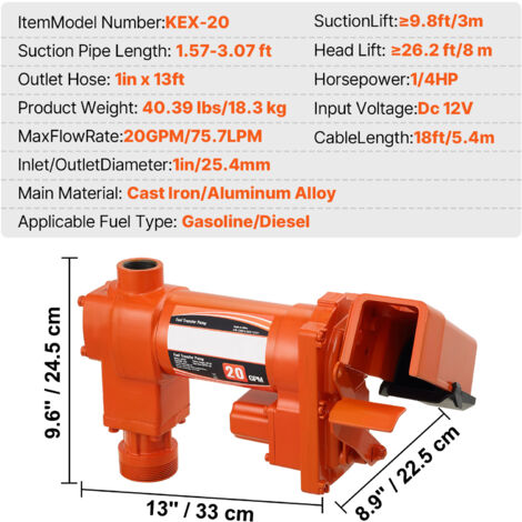 Convient pour l'essence, le diesel et le kérosène. 2 x tubes de câblage Convient pour l'essence, le diesel et le kérosène Matériau de l'article : Alliage d'aluminium / fonte Pompe Transfert Gasoil DC 12 V, Pompe d'extraction Pompe de Dimensions du produit : 13 x 8,86 x 9,65 pouces / 330 x 225 x 245 mm, Puissance : 1/4 CV Accessoires complets Cette pompe d'extraction d'essence comprend tout le nécessaire pour le transfert de carburant. Hauteur d'aspiration : ≥ 9,8 pi/3 m Kit d'accessoires complet : Cet ensemble de pompe d'extraction d'essence comprend un tuyau de refoulement en caoutchouc de 4 m, un tuyau d'aspiration réglable 0,53-0,96 m, une buse de carburant, un connecteur et du ruban PTFE Elle fonctionne non seulement avec l'essence et le diesel, mais aussi avec le kérosène, les mélanges d'éthanol, le méthanol et le biodiesel. Compatibilité réglable Le tuyau d'aspiration télescopique vous permet d'ajuster sa longueur en fonction de différentes profondeurs de baril, ce qui rend cette pompe de transfert idéale pour divers environnements d'installation. Contenu du coffret 1 x tuyau de sortie Construction robuste : Fabriquée en fonte robuste, cette pompe de transfert carburant résiste à la rouille grâce à sa finition par électrophorèse. Fonctionnement flexible Avec un tuyau de 4 m de long, cette pompe de transfert diesel vous offre la flexibilité de ravitailler divers types de véhicules ou d'équipements, en particulier dans les espaces restreints ou difficiles d'accès. Pompe Aspiration 3m Refoulement 8m Tuyau 4m Pompe Transfert Carburant VEVOR 12 V CC 60,5 L/min 1/4 CV Avec Buse Manuelle ,Tuyau De Refoulement Et D'Aspiration,pour Essence,Kérosène,Biodiesel | Leroy Merlin Pompe Gasoil 12v 1 x câble d'alimentation de 5,4 m, 1 x adaptateur Nettoyage facile Après le ravitaillement, le récupérateur d'huile récupère les gouttes du pistolet, contribuant ainsi à la propreté de votre espace de travail. Cette pompe de transfert de diesel est équipée d'un tuyau de 4 m pour un ravitaillement facile et durable Conception du bac récupérateur d'huile : Le bac intégré empêche les fuites d'huile après le ravitaillement, préservant ainsi la propreté du sol. 1 x bac de récupération d'huile, 1 x ruban PTFE, 1 x fil de terre Elle est dotée d'une protection contre les surcharges thermiques pour éviter la surchauffe du moteur Transfert de carburant efficace : Cette pompe de transfert de carburant est dotée d'un moteur de 2 000 tr/min, d'un débit de 75,7 L/min, d'une hauteur de refoulement de 8 m et d'une aspiration de 3 m. Elle est largement utilisée pour le ravitaillement ou la vidange des réservoirs de véhicules, de camping-cars, de bateaux, de fermes et de systèmes de stockage de diesel. Cette pompe de transfert de carburant 12 V CC de maximise l'efficacité avec un moteur de 3 000 tr/min. Elle transfère du carburant jusqu'à 20 GPM, assurant un ravitaillement rapide Poids net : 35,82 lb / 16,25 kg Caractéristiques · Numéro du modèle du produit : KEX-20 · Type de produit : Pompe de transfert de carburant antidéflagrante · Débit maximal : 20 GPM/75,7 L/min