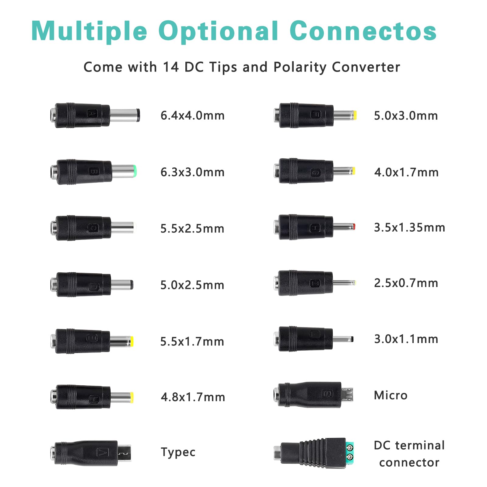 Convient aux routeurs sans fil, modems ADSL, HUB, caméras de surveillance, caméras WiFi, lecteurs DVD, équipements audio/vidéo, imprimantes 3D, systèmes de vidéosurveillance, moniteurs LCD, haut-parleurs Bluetooth, systèmes stéréo, pianos numériques, claviers portables, émetteurs IR, bandes lumineuses LED et autres appareils domestiques/portables. Alimentation universelle pour bandes de LED - Test et Avis Adaptateur d'alimentation réglable 3 V ~ 24 V 5 A 120 W, adaptateur d'alimentation universel, alimentation 100 V-240 V CA vers CC 5 A portée: Entrée : CA 100 V~240 V 50/60 Hz Tension de sortie : DC 3V~24V réglable Courant de sortie/watt : 5 A, max 120 W. Une tension incorrecte peut endommager votre appareil. Nous recommandons d'utiliser moins de 80 % de la capacité totale pour prolonger la durée de vie de l'équipement. Ne surchargez pas l'appareil ! 【Adaptateur D'alimentation】 : Entrée : 100 à 240V AC, 50/60Hz, Tension de sortie réglable de 3V à 24V DC. 3~24V 5A 120W Adaptateur Alimentation Réglable, Adaptateur Secteur Universel Convertisseur, 100V 【Application】 : Convient à la plupart des appareils électroménagers CC. Connecteur de sortie CC : 5,5 mm x 2,5 mm (intérieur « + », extérieur « - ») 14 tailles d'embouts : 6,5 x 4,4 mm + broche, 5,5 x 2,1 mm, 5,5 x 3,0 mm + broche, 5,0 x 2,5 mm, 6,3 x 3,0 mm, 5,5 x 1,7 mm, 4,8 x 1,7 mm, 4,0 x 1,7 mm, 3,5 x 1 pouce 0,35 mm, 3,0 x 1,1 mm, 2,5 x 0,7 mm, connecteurs Micro USB, Type-C et DC. Avant de connecter ce produit, veuillez vérifier la plage de tension de l'appareil. NAN® Alimentation AC vers DC Convertisseur AC à DC Alimentation 30A 13... Adaptateur 120W 5A JZK Alimentation à Tension Réglable DC 3V-24V 5A 120W Avec Affichage Numérique 100-240V AC à DC Alimentation Routeur Imprimante 3D Puissance maximale 5A, 120W ; peut fournir un courant inférieur à 5A, tel que 300mA, 500mA, 1A, 1,5A, 2A, 2,5A, 3A.