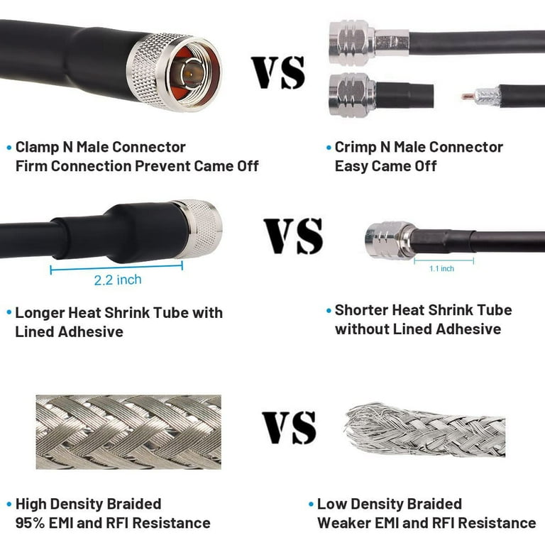 ✅【 Performance 】 Le conducteur en cuivre pur et le blindage tressé en cuivre étamé offrent la meilleure transmission de données de sa catégorie avec une atténuation minimale et une flexibilité exceptionnelle. ✅ Tube thermorétractable à double paroi avec couche adhésive pour une meilleure protection des connecteurs de l'environnement extérieur. RANGEFUL 1m N mâle (Hex) vers N femelle câble coaxial étanche IP67 - HF400 Flexible 50 Ohm Câble d'extension (équivalent LMR400 UF UltraFlex) - pour WiFi LTE 4G 5G Mobile Wireless Routeur Antenne Atténuateur N-mâle vers N-femelle avec dissipateur thermique 20 dB 15W ✅【 Gaine thermorétractable à double paroi 】 Couche adhésive supplémentaire meilleure protection des connecteurs contre l'environnement extérieur. Rallonge 3m câble coaxial LMR240 RSC-240 prise N femelle vers RP-SMA ✅【 Fabriqué dans l'UE 】 Les connecteurs sont soudés avec de la soudure additionnée d'argent pour un meilleur contact et une longue durée de vie. Conformité totale avec les normes européennes CE, RoHS, REACH, CPR Eca. Connecteur Coaxial Cuivre Blindage Double N Mâle Vers N Mâle Hex 12m Câble Coaxial - HF240 (équivalent à LMR240 Connecteur étanche IP67 Conformité totale aux normes européennes CE, RoHS, CPR Eca. Câble coaxial flexible N mâle (Hex) vers N femelle à faible perte pour intérieur/extérieur HF400 UFDouble blindage avec gaine en PVC noire non contaminante Longueur : 3 mètres CandidatureLargement utilisé avec les antennes, les routeurs, les répéteurs 4G/5G, les systèmes d'amplification mobiles, les scanners radio, les modems, les émetteurs de voiture, les radios CB, les radios WiFi, les antennes GPS, divers appareils RF, les appareils LAN sans fil, les équipements de test, etc. ✅ Conducteur toronné en cuivre pur et blindage tressé en cuivre étamé garantissent la meilleure transmission de données de sa catégorie avec une atténuation minimale et une flexibilité exceptionnelle.