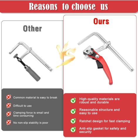 Les serre-joints à levier sont particulièrement utiles lorsque de nombreux serre-joints doivent être mis en place et desserrés en un minimum de temps Le bras mobile dispose d'un design à cliquet pour assurer une force de serrage élevée. Serre Joint Etabli BIGP 2 Pièces Serre Joint à Levier, Élément De Serrage ø20 Serre Joint Rapide L'opération est plus pratique. Facile à utiliser: Insérez la barre cylindrique de la pince de serrage dans l'établi, puis placez la planche en bois sous la pince de pression et ajustez l'angle de la poignée, ce qui est pratique et économise du travail et améliore considérablement l'efficacité du travail. Si vous avez des questions, n'hésitez pas à nous contacter. AXPOWER Serre Joint Rapide 1 Pièces 160 Serre-Joint à Levier,Serre... Serre-joint à levier de serrage rapide en acier forgé | WURTH Pince multi-angle, grande zone de serrage et rembourrage en plastique souple installé pour éviter que la surface du matériau ne se coince. Large application: il peut être utilisé pour presser, écarter et fixer rapidement des pièces en différents matériaux tels que le bois, le plastique et le métal. Fixation par vis anti-chute: Le bas de notre pince à levier est équipé d'une vis de protection anti-chute pour empêcher la tige de tomber.