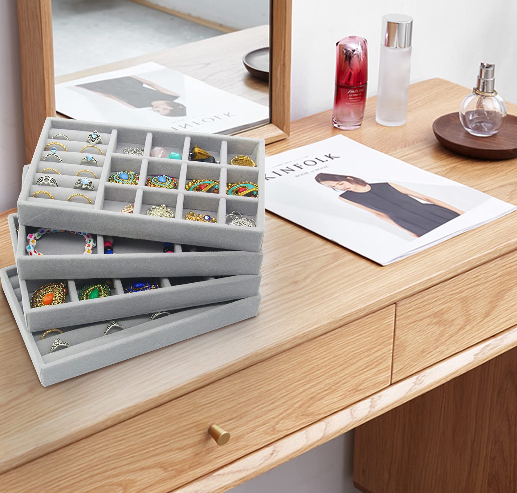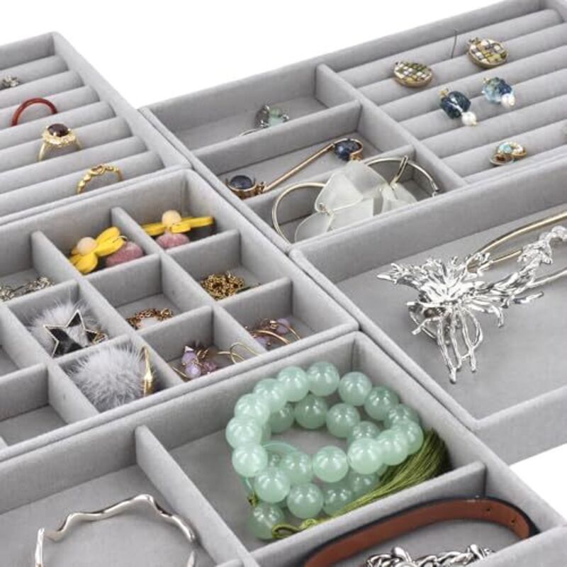 Parfait pour votre femme, petite amie, fille, maman ou amis proches Rainmae Lot de 12 plateaux de rangement pour bijoux, empilables, inserts réglables en velours, pour bagues, boucles d'oreilles, colliers, gris, 6 styles 4,64,6 sur 5 étoiles(11 Rangement empilable : vous pouvez empiler ces plateaux les uns sur les autres ou les utiliser séparément. Large gamme d'utilisations : ces boîtes à bijoux sont parfaites pour contenir des boucles d'oreilles, colliers, bracelets, bagues et autres petits accessoires. Cette vitrine de rangement peut également être utilisée pour ranger des bijoux pour poupées d'enfants. Notre ensemble de plateaux à bijoux est adapté pour les chambres, les dressings, les salles de bains et les armoires, et est également idéal pour présenter des bijoux dans les centres commerciaux et les magasins de détail. Cela les rend parfaits pour des bijoux de différentes tailles. Plateaux à Bijoux Empilables Velours, 12/18/24 Compartiments Pour Bagues Boucles Doreilles Et Bracelets 90735618 En outre, l'organisateur de bijoux pour tiroir est un cadeau idéal pour la Saint-Valentin, la fête des mères, un anniversaire, Noël ou d'autres célébrations. Au total, les plateaux ont un nombre combiné de 84 compartiments, tous de formes et de tailles différentes. Léger et de taille appropriée, chaque plateau de rangement s'adapte parfaitement à la plupart des tiroirs standard, vous aidant à garder vos accessoires organisés et faciles à trouver Citylife Bacs de rangeent en plastique transparent de 17 l avec 6... Coffret Organisation Accessoires Rainmae Lot De 12 Plateaux De Rangement Pour Bijoux, Empilables Rangement Bijoux Pour Dressing La surface de l'organisateur de tiroir à bijoux empilable est légèrement texturée pour une meilleure prise en main, ce qui les rend stables lorsqu'ils sont empilés et vous aident à économiser de l'espace.