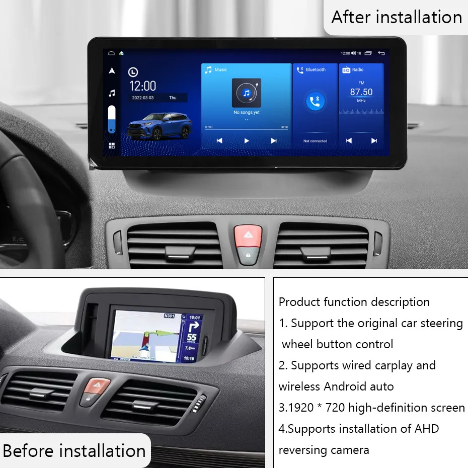 Spécifications : Matériau : plastique, métal Système d’exploitation : Android 14 Taille de l’écran : 9 pouces Résolution : 1280 x 800, 800p Mémoire : 4 Go (RAM) + 64 Go (ROM) Bluetooth : 5., 0 Modulation de fréquence : 76,0 MHz - 108,0 MHz Compatibilité : Compatible avec Renault Megane 3 (2009-2014) Contenu : 1 autoradio Autoradio Bluetooth et Autoradio Android à votre portée [Compatibilité véhicule] Cet autoradio est compatible avec la Renault Megane 3 (2009-2014). Connectez le câble USB de votre téléphone à la prise radio pour projeter l'image de votre téléphone sur l'écran de l'autoradio. Profitez d'une expérience de conduite optimale. Autoradio Android 9 Pouces 4+64G Autoradio, 9 Zoll Poste Radio Voiture Bluetooth Mit écran Tactile 9 Pouces Veuillez vérifier le modèle de votre voiture avant de passer commande, calculer l'année et le numéro de modèle et vérifier la compatibilité, ou nous envoyer une photo complète des prises situées à l'arrière de la console centrale et de l'unité principale de bord afin de vous assurer de leur compatibilité et de vous aider à confirmer si vous avez besoin d'autres faisceaux de câbles ou adaptateurs. Vous pouvez regarder vos films et vidéos préférés pour un voyage plus agréable., Microphone externe inclus. [Caméra de recul] Une fois l'autoradio connecté à la caméra de recul, la caméra de recul AHD affiche automatiquement l'image en marche arrière. Vous pouvez choisir une connexion filaire ou sans fil à CarPlay, vous connecter à votre téléphone mobile iOS, accéder au carnet d'adresses, aux e-mails, aux notifications, à la navigation, à la musique, aux vidéos et à d'autres informations, et utiliser la commande vocale. Hikity Autoradio 1 Din Carplay Android Auto FM EQ, 6,9 Pouces Bluetooth Le système Android Auto sans fil intégré intègre parfaitement le téléphone et le lecteur Android de l'utilisateur. Caméra de recul] Une fois l'autoradio connecté à la caméra de recul, la caméra de recul AHD affiche automatiquement l'image en marche arrière. Elle simplifie votre stationnement quotidien