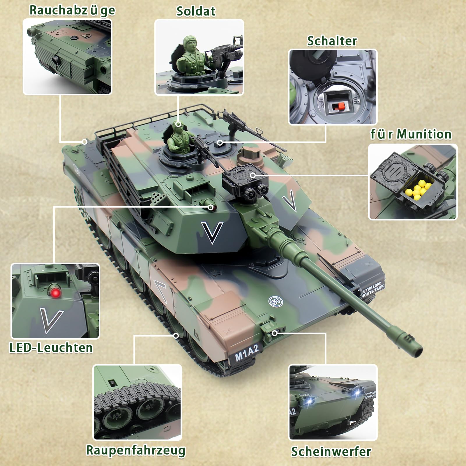 Large zone d'orientation : la tourelle peut pivoter à 330 degrés de gauche à droite, la muselière peut se déplacer de haut en bas de 30 degrés. Fisca 1/16 Télécommande Voiture Haute Vitesse, 4WD RC Drift Voiture De Course Rapide 20mph Camion 24 Ghz Off Road 4x4 Buggy Amz Char M1A2 ABRAMS DESERT 1/16 RC Hobby Engine HE0817 Temps de charge : 3 à 4 heures. 15 canaux - Fonction complète : avance/arrière, rotation avant droite/gauche, rotation arrière droite/gauche, rotation centrale vers droite/gauche ; tourelle rotative, museau vers le haut/bas, tirer des balles souples. Dimensions du produit : 47 x 19,6 x 20,1 cm. Durée de jeu : 20 à 25 minutes. Excellentes performances de conduite : 3 niveaux d'accélération de la vitesse vers l'avant avec une capacité d'escalade de 30 degrés. Fisca Le réservoir télécommandé à 15 canaux est fabriqué en matériau de haute qualité et est très détaillé comme le vrai pour une utilisation en intérieur et en extérieur. Char Tire BBs Airsoft DAXX 1/16 RC Tank Char Militaire Jouet, 2.4Ghz Telecommandé Avec Fonction Shot, Son Et éclairage, Cadeau Parfait Pour Adultes - De Combat Principal M1A2, Ocre Jaune, 62 X 23 20 Cm Tank RC 2.4 GHz 15 Canaux Batterie : batterie rechargeable 7,4 V 1500 mAh. fisca 1/16 télécoande Voiture Haute Vitesse, 4WD RC Drift Voitures de... 1 manuel d'utilisation (français non garanti)., 1 cible., 1 soldat., 1 chargeur., 1 bouteille., 2 pistolets., 2 paquets de balles., 1 batterie rechargeable., Conseils : 1., Étant donné que le pistolet à air est puissant, ne tirez pas sur des personnes ou des animaux. Tout comme le vrai réservoir, vous offre une expérience plus réelle. Distance de contrôle : 0 à 160 pieds et plus. Contenu du colis : 1 réservoir., 1 manette., 1 chargeur USB. Simulation de fumée et de recul : le réservoir a une fumée simulée (vapeur), et pendant la prise de vue, il y a l'action de recul. Il peut supporter plusieurs joueurs pour faire fonctionner des réservoirs en même temps sans interférence. La surveillance d'un adulte est recommandée., 3., Le contrôleur nécessite 3 piles AA (non fournies)., 4., Lorsque le jouet n'est pas utilisé, veuillez retirer la batterie. Fréquence de la télécommande : 2,4 GHz.