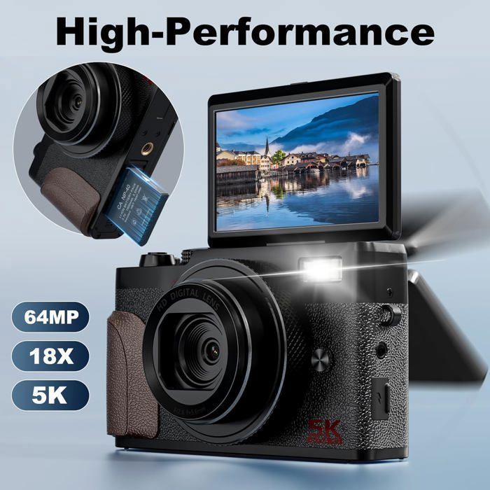 La fonction de mise au point automatique et la mise au point semi-manuelle permettent des détails plus nets, rendant la photographie plus facile. Appareil Photo 5K 64MP 【Utilisation Polyvalente et Molette de Mode】 Cet appareil photo offre une variété de modes de prise de vue via la molette de mode, y compris la prise de vue en continu, la vidéo au ralenti, le time-lapse et les filtres d'effets spéciaux. Test de l'appareil photo numérique 4K 64MP : idéal pour débutants Il propose une interface conviviale et délivre des images nettes et fluides. Des photos parfaites grâce à l'autofocus et au zoom] Grâce à l'exposition automatique, à l'autofocus et au zoom numérique 18x, vous obtenez des images nettes sans aucune compétence préalable Voyage Appareils Photo Numériques 5K 64MP, Zoom Numérique Appareil Photo Découvrez l'appareil photo numérique ETHNICS ORIGINS, offrant une résolution de 64MP et un enregistrement vidéo Ultra HD 5K. Avec un zoom optique de 18X et un...
