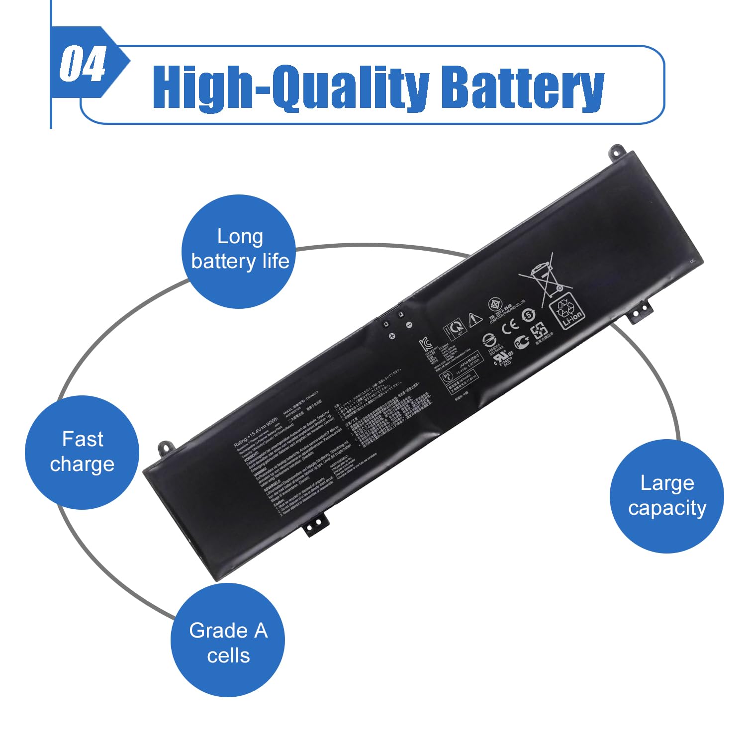 Installer une nouvelle batterie Éteignez l'ordinateur portable et débranchez-le. Modèle de batterie : C41N2013 ; Tension : 15,4 V ; Capacité : 90 Wh/5845 mAh ; Références de remplacement : C41N2013, C41N2013-1, 0B200-03880000, 0B200-03880100, 0B200-03880200 ; Ordinateurs portables compatibles : Asus ROG Strix Scar 15 séries G533, G533QR, G533QS, G533QM et G533ZS GHONLZIN Fabricant professionnel de batteries pour ordinateurs portables Modèle : ASUS C41N2013 Elles sont protégées contre les surcharges, les surintensités, les courts-circuits et les températures élevées. 【Facile à Installer】De la même taille que la batterie d'origine, facile à installer et dotée d'une grande capacité, elle assure des performances durables à votre appareil. 【Type de Batterie】Modèle : C41N2013 ; Tension : 15,4 V ; Capacité : 90 Wh ; Type : Li-ion ; Batterie de remplacement pour ordinateurs portables ASUS. 【Compatible avec Différents Modèles】Compatible avec les batteries d'ordinateurs portables ASUS ROG Strix G17, G713, G513 et Zephyrus GA503, GU603HE. Compatible avec Différents Modèles]Compatible avec les batteries d'ordinateurs portables ASUS ROG Strix G17, G713, G513 et Zephyrus GA503, GU603HE. [Haute Sécurité]Batterie de remplacement pour ordinateurs portables ASUS, sans effet mémoire, charge rapide et faible consommation d'énergie Conservez l'appareil et la batterie dans un endroit frais et sec (la chaleur détruit la batterie). C41N2013 Batterie compatible pour ordinateur portable Asus Batterie Ordinateur Portable ASUS C41N2013 15.4V 90Wh 5675mAh C41N2013 Laptop Batterie Compatible Avec ASUS ROG Batterie 15.4v 90wh Retirez l'ancienne batterie, installez la nouvelle batterie sur son boîtier, revissez les vis et connectez les câbles de la nouvelle batterie. Désactivez les programmes inutiles qui consomment de l'énergie sur votre ordinateur. Éteignez l'ordinateur ou utilisez le mode veille prolongée pour minimiser la consommation de la batterie. Ensuite, chargez complètement la batterie et déchargez-la. Ce processus peut être répété 3 à 5 fois, ce qui est bénéfique pour activer la capacité maximale des ions lithium.