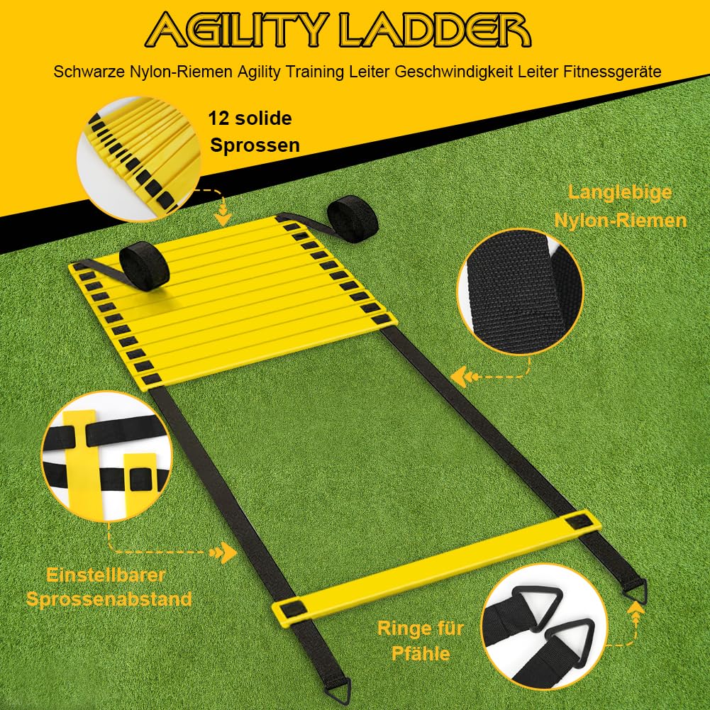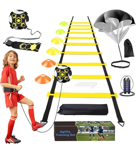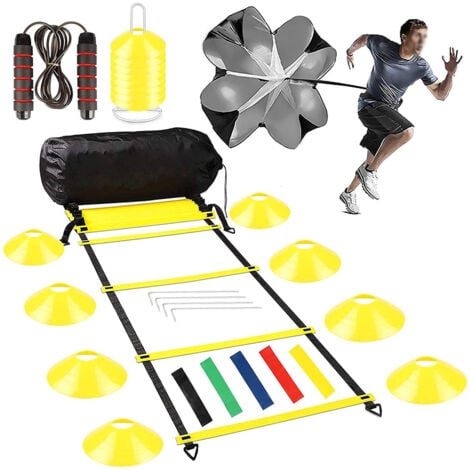 Échelle d'entraînement de coordination pour exercices 8m Idéal pour compléter votre kit entrainement foot. échelle Coordination 8m Plots Sport Kit Entrainement Foot LWuuywa Échelle D'entraînement - 6 M Kit Entrainement Foot Club 【KIT ENTRAINEMENT FOOT COMPLET】Kit entrainement football 16-en-1 comprenant une échelle de coordination à 16 barreaux, 16 plots sport flexibles, 5 bandes de résistance, 4 piquets de fixation, un parachute de résistance, une corde à sauter et un sac de transport pratique. 【IDÉAL POUR TOUS LES SPORTIFS】Ce football accessoire est un cadeau parfait pour enfants, adolescents et adultes. Favorise la coordination, l’agilité, l’équilibre et la vitesse. Sonnewelt Accessoires d'entraîneent de football, échelle de... KIKILIVE Échelle de Rythe Entraineent de Football Échelle d'agilité 【PLOTS SPORT FLEXIBLES POUR L’AGILITÉ】16 plots sport flexibles pour des exercices variés de coordination et d'agilité. 【PARACHUTE DE RÉSISTANCE POUR PLUS DE PUISSANCE】Parachute réglable avec une résistance jusqu’à 14 kg. Fixation sûre avec 4 piquets.