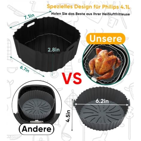 Moule en silicone pour friteuse à air chaud : Vous recevrez 2 moules en silicone noir pour friteuse et 2 pinces à main noires. Réduisez le temps de nettoyage et prolongez la durée de vie de votre friteuse à air chaud. Compatible uniquement avec les friteuses Philips 4,1 L (modèles HD9200, HD9252, HD9255), cet ensemble de 3 moules en silicone de 18 cm est conçu pour optimiser l'espace de cuisson et faciliter le nettoyage Air Fryer Philips 2 Moules En Silicone Pour Airfryer Philips 4.1L - Accessoires De Cuisson Pour Friteuse Sans Huile Pour Hd9252/90 Hd9255/80 Le revêtement en silicone pour friteuse n'affectera pas la saveur des aliments et garantira le goût original des aliments eux-mêmes. Large application : Nos moules en silicone peuvent être utilisés dans la friteuse, le four, le micro-ondes, le réfrigérateur et peuvent être réutilisés après le lavage, après l'utilisation de la plaque de cuisson de la friteuse peut empêcher les résidus de nourriture et les taches d'huile de rester sur l'ustensile de cuisson. Matériau en silicone de haute qualité : Les moules en silicone pour friteuse sont fabriqués en silicone de qualité alimentaire, non toxique, insipide, sans BPA, antiadhésif, résistant aux rayures, à l'abrasion, aux déchirures et aux taches, résistant à la chaleur jusqu'à 220°C (428°F). Conception améliorée de l'évacuation de l'huile : Le système de drainage interne de l'huile permet de chauffer les aliments de manière plus uniforme et de laisser l'huile s'écouler naturellement. Accessoire Cuisson Air Fryer Remplace Papier YINGRACE 20CM Air Fryer Accessoires, Moule Silicone XL Pour Philips Airfryer XL 6,2L 4,2L Kit De Cuisson Airfryer Philips Spécifications Taille : 15*18*8cm Poids : 100g Matériau : Silicone Couleur : Noir Quantité : 2 moules en silicone et 2 pinces à main Résistance à la chaleur : jusqu'à 220 degrés Celsius Emballage : Comprend 2 moules en silicone noirs et 2 pinces à main noires En outre, il peut être utilisé pour la cuisson, le gril, le service des aliments et des fruits, etc. C'est une nécessité quotidienne pour les familles multifonctionnelles., 5., Ce moule en silicone pour friteuse à air chaud permet d'économiser du temps et des efforts en gardant la friteuse aussi propre qu'avant l'utilisation.