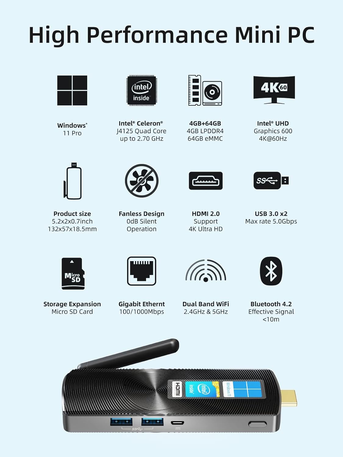 [Écran double 4K] Fonctionne sur 11 Pro//Linux avec prise en charge HD 2., 0 pour les écrans doubles 4K, améliorant votre expérience multimédia [Mini PC stick sans ventilateur de poche] sans ventilateur pour un fonctionnement silencieux et un format de poche, idéal pour une utilisation en déplacement Pc Stick Koolenry Ordinateur Portable Compatible J4125 Fanless Mini PC Mini Pc Pas Cher Il offre un espace de stockage important avec 8 Go de mémoire LPDDR4 et 128 Go de mémoire eMMC, extensible jusqu'à 1 To par carte MicroSD. [PC de bureau performant] Équipé d'un processeur J4115 robuste, ce mini PC garantit des performances stables et fiables. Stick PC Mini PC Stick Windows 11 Pro, PC Stick equipado Celeron J4125, 8 GB de RAM, 512 GB M.2 [Fonctionnalités intelligentes pour une utilisation commerciale] Ce PC HD Stick est doté d'un emplacement pour verrou de sécurité pour les applications commerciales, prend en charge PXE/Auto Power On/RTC Wake, parfait pour l'affichage numérique, les panneaux d'affichage et les applications IOT. Note: réflexion de lumière et différents écrans peuvent causer la couleur de l'article dans un peu différente de la vraie chose. Type d'Antenne Interne Résolution 4K Capacité de décodage 1080P (Full-HD) Voir plus