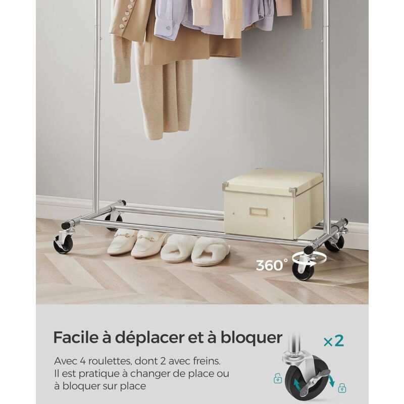 - Poids du produit : 3,5 kg. Grande capacité de rangement : ce portant à vêtements en métal de 40,4 x 90,9 x 158 cm sert d'extension de votre placard, ajoutant un grand espace de suspension pour garder jusqu'à 40 chemises en ordre. Robuste et durable - 1 kit d'accessoires. Les tubes en acier reliés par des vis rendent le rail supérieur qui peut supporter jusqu'à 40 kg et offre à vos vêtements lourds un soutien stable pour les années à venir Facile à assembler : les pièces étiquetées et les instructions illustrées vous permettent de configurer facilement ce portant à vêtements avec roulettes afin que vous puissiez rapidement avoir plus d'espace pour ranger vos vêtements Portant Métallique Mobile Rangement SONGMICS Porte-vêtements Avec Roulettes, 90 Cm, Portant à Vêtements Pour Suspendre Les Vêtements, Avec étagère Portant Mobile Rangement Vêtements - 1 mode d'emploi (français non garanti). Avec étagère de rangement : l'étagère inférieure en maille peut supporter jusqu'à 10 kg, ce qui la rend parfaite pour vos chaussures et boîtes de rangement. La maille est étroitement espacée, de sorte que même vos talons hauts peuvent trouver leur place ici [Capacité de rangement] Ce portant à vêtements en métal de 40,4 x 90,9 x 158 cm sert d'extension de votre placard, ajoutant des tonnes d'espace de suspension pour garder jusqu'à 40 chemises en ordre SONGMICS Portant à Vêtements avec roulettes, Lot de 2, Tringle Robuste et durable : 25,4 mm de diamètre. SONGICS Portant à Vêteents en étal, Porte-vêteents, Porte-anteau Longueur 92,5 c, avec...