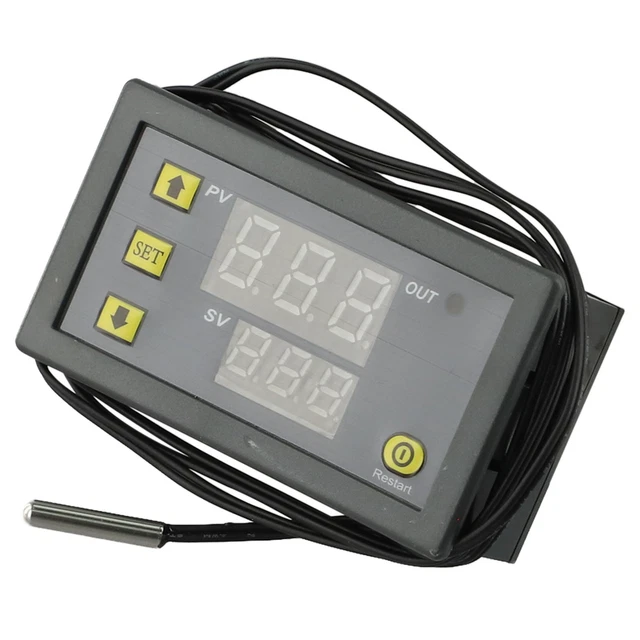 Cela le rend convivial et fiable pour une utilisation à long terme. * Capteur étanche : le contrôleur de température comprend un capteur en acier inoxydable de 1 m, qui est étanche et résistant à la rouille. Exigences environnementales : -10 ~ 60 ℃ humidité 20 % -85 %. Puissance d'entrée (en option) : 12 V, 24 V, 110 V ~ 220 V. Lorsque la température mesurée atteint le niveau prédéfini, le contrôleur déclenche une alarme. Thermostat numérique W3230 écran LED, avec capteur NTC Thermostat numérique W3230 1 pièce, régulateur de température AC 110V Sortie : 1 relais de sortie, capacité = 20 A. [Utilisation multifonctionnelle] Parfaitement adapté pour les unités de réfrigération, les systèmes de climatisation et les installations d'incubation, cet appareil répond aux besoins des professionnels et des amateurs. Contenu de l'emballage : 3 contrôleurs de température numériques W3230., Lot de trois thermostats : chaque paquet contient trois contrôleurs de température numériques W3230 conçus pour fournir une gestion précise de la température pour plusieurs applications à la fois. Fréquence de rafraîchissement : 0,5 s. Capteur étanche Inox Lot De 3 Contrôleurs De Température Numériques W3230, Interrupteur Régulateur Froid Chambre Incubation Sonde étanche : thermostat numérique LCD W3230 230 V avec capteur équipé d'une sonde étanche NTC10K en acier inoxydable de 1 m qui peut être connectée à l'endroit où une mesure de la température est nécessaire Caractéristiques : Nom de la pièce : contrôleur de température numérique. Il maintient différents environnements dans la grande plage de température, avec une plage de contrôle de -50 à 120 °C et une précision de 0,1 degrés Celsius. Résolution : 0,1 ° ℃ à -9,9 ~ 99,9, 1 ° ℃ à d'autres plages de température Précision de mesure de la température : 0,1 ℃. Caractéristiques : * Qualité du matériau : le thermostat numérique LCD est compact et léger, ce qui le rend facile à transporter et à ranger., En plastique ABS. Vous pouvez définir des limites de température maximale et minimale pour éviter les accidents. Capteur étanche : le capteur robuste en acier inoxydable de 1 m est imperméable et résistant à la rouille, il reste fonctionnel même dans des conditions difficiles sur de longues périodes.