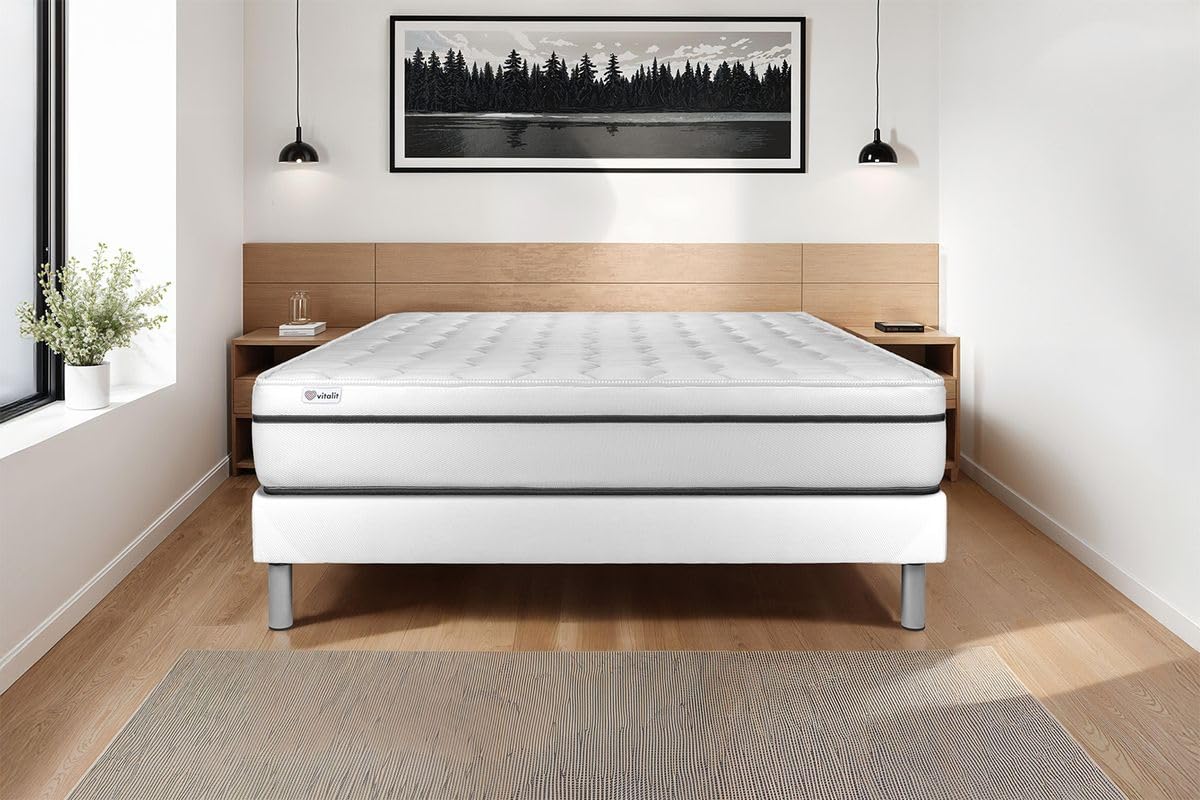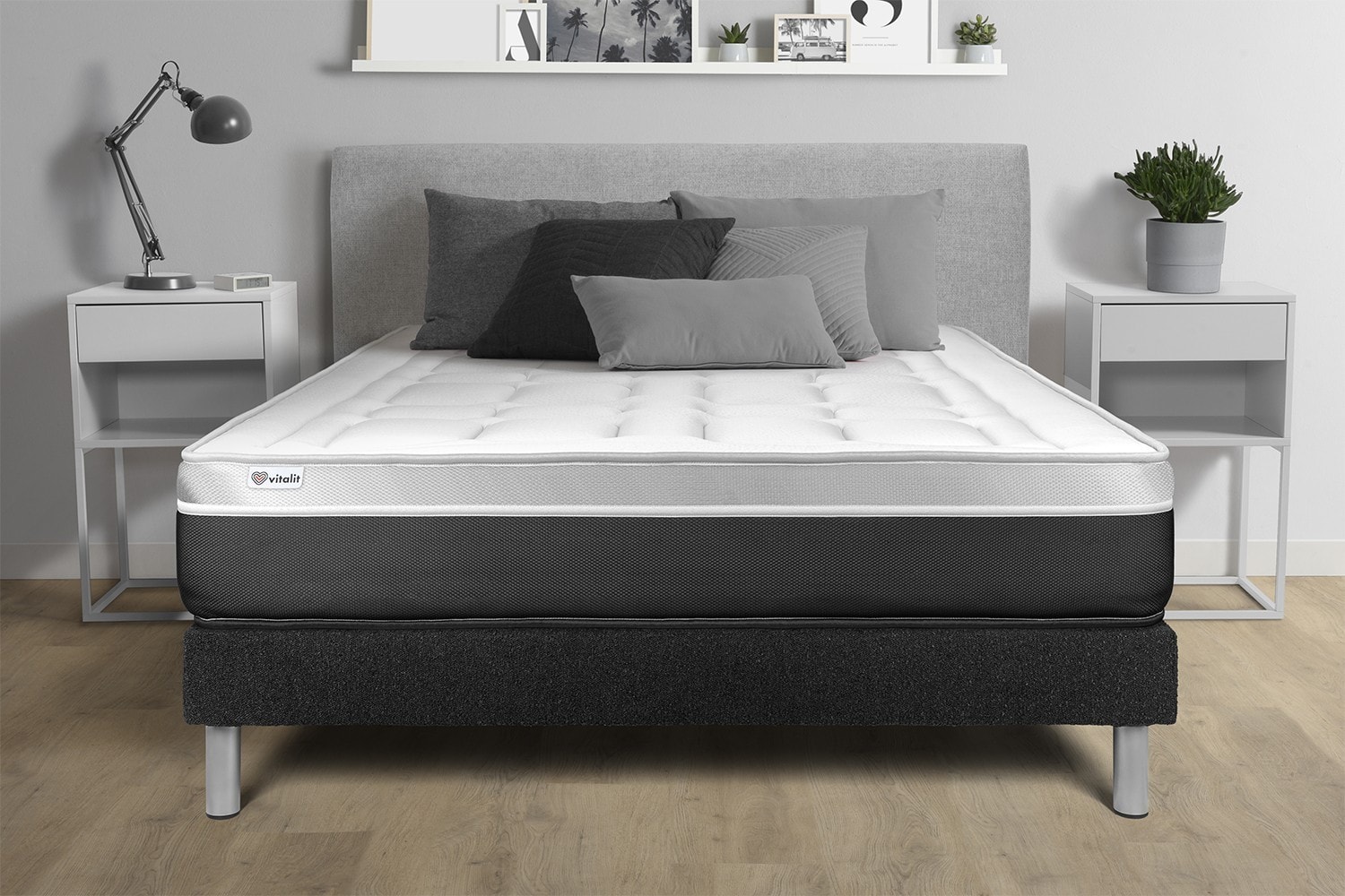 Mousse polyuréthane à mémoire de forme D 55 kg + Mousse polyuréthane Soft HD Sa maxi-épaisseur de 26 cm garantit une durée de vie prolongée du matelas. Livraison offerte au pas de porte pour les maisons individuelles ou au pied de l'immeuble. Tissu Maille 100% polyester 855G/M2 respirable et résistant certifié OEKO-TEX Standard 100 Son soutien ferme et son accueil moelleux s'adaptent à votre morphologie, réduisent les points de pression et préviennent les douleurs dorsales. OEKO-TEX 100 > Literie exempte de produits toxiques pour le corps et pour l'environnement. Plate-Bande 3D micro-aérée 100% Polyester pour optimiser l'aération du matelas Ensemble literie (Matelas + Sommier) Mousse polyuréthane à mémoire de forme Confort : Equilibré - Accueil moelleux - Soutien ferme, 7 zones de confortSommier Indépendance de couchage : Excellente - Réversible Eté/Hiver Matelas Compressé Livraison Roulé Ensemble 90x190 Mémoire De Forme - Sommier Kit Regen | Maisons Du Monde Ensemble Matelas Sommier Matelas mousse 90X200 SPORTY, Épaisseur 24 CM, Ergonomique, idéal pour les sportifs, Dehoussable Colisage : 2 cartons (L : 210 cm x l : 22 cm x H : 16 cm) Matelas - Constellation Afin de faciliter la livraison et l'accès à certains logements, ce matelas est livré compressé et enroulé. Prise de rendez-vous par téléphone, SMS ou e-mail. Adapté pour tous types de matelas Matelas 160x200 cm mousse - matelas 2 places épaisseur 24 cm - lit Structure et traverses de renfort en pin massif Commencer chaque journée avec vitalité grâce à notre matelas VITAL SOFT., Epaisseur 26 cm Le sommier en kit simplifie l'accès à toutes les pièces. Son tissu micro-perforé assure une excellente aération.