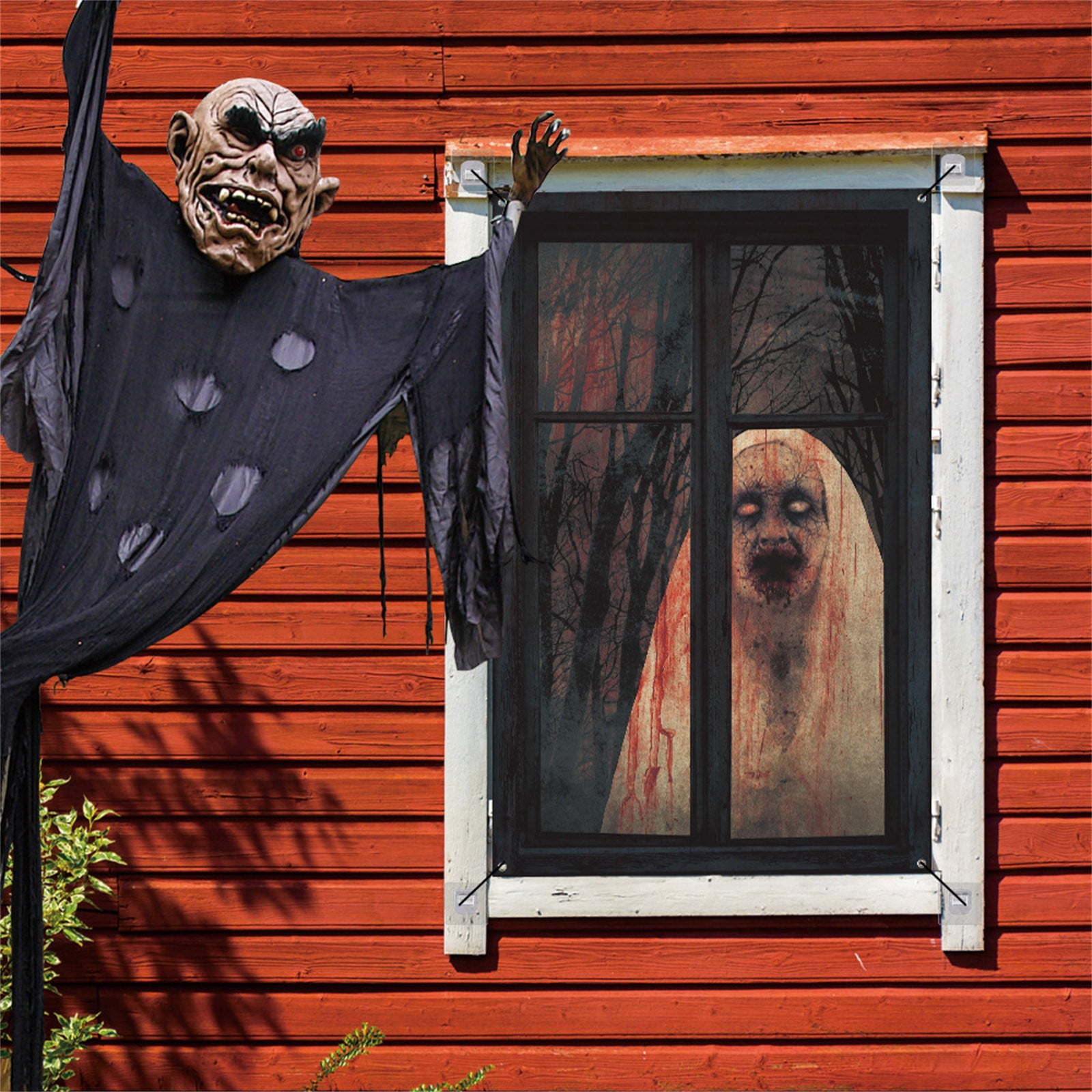 Feuille de décoration de fenêtre effrayante pour Halloween, matériau Décoration Halloween Décoration Fenêtre Halloween - Couverture Effrayante Fantôme Sanguinaire - 104x94 Cm - Facile à Installer Fenêtre Rideau Halloween Fille Horreur 👻Un Incontournable pour Les Fêtes de Fin D'année - Cette décoration de fenêtre d'Halloween convient aux rideaux de porte d'Halloween, aux rideaux, aux décorations murales, aux toiles de fond de fête et peut être combinée avec des lanternes citrouilles, des accessoires squelettes, etc. 👻Motif Fille d'Horreur - Cette décoration de fenêtre d'Halloween est imprimée d'un motif de fille d'horreur, dont l'image réaliste et effrayante vous donnera la chair de poule. 🎃Tissu de Haute Qualité - Cette décoration de fenêtre d'Halloween est fabriquée dans un tissu doux et résistant à la décoloration. Halloween Decoration Effrayant Fenetre - Deco Halloween pour Exterieur, Interieur, Couverture de Fenêtre D'halloween Décorations Rideaux D'horreur pour Mur, Porte, Fête de L'horreur Le motif d'horreur est durable et peut être rangé et réutilisé pour Halloween. Décorations de fenêtre pour l'halloween 👻Facile à Utiliser - des trous métalliques sont présents aux quatre coins de cette décoration de fenêtre d'Halloween. Que ce soit sur la fenêtre, le porche ou le mur, elle créera instantanément une ambiance d'Halloween effrayante dans votre maison.