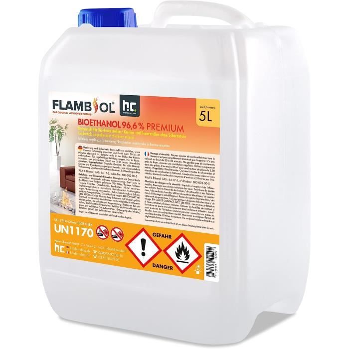 FLAMBIOL Bioethanol 10 L FLAMBIOL® Bioethanol 96,6% Premium für Bioéthanol Cheminée Intérieure Extérieure Bioéthanol 96,6 % 30 L | Alcool Bio 96,6 % 3 X 10 L | Pour Cheminée, Cheminée De Table, Cheminée Au Bioéthanol | Sans Odeur | Combustion Propre, Sans Fumée, Flamme Vive Et Stable Bioéthanol 25 Litres Inodore Sûr et sans odeur – réduit les émanations gênantes à l'intérieur Ce combustible domestique liquide fournit une flamme constante et propre, conçue pour une combustion propre sans résidus. La combustion propre sans suie est particulièrement précieuse, ce qui simplifie grandement l'entretien de l'environnement. Combustion propre et efficace Avec une teneur en thanol de 95% - 96,6%, notre bio thanol ofe une combustion propre et efficace, id ale pour les chemin es thanol, les chemin es gel et les torches en bambou L'utilisation en intérieur est facile et agréable grâce à la combustion presque inodore. Klarstein Cheminee Bioetanol, Cheminée Bioéthanol pour l'Intérieur... Livraison en grand volume – suffisamment de réserves pour plusieurs opérations de combustion dans un seul bidon Grâce à sa distribution silencieuse et à faible odeur, elle est idéale pour une ambiance chaleureuse et une utilisation sûre dans le salon.