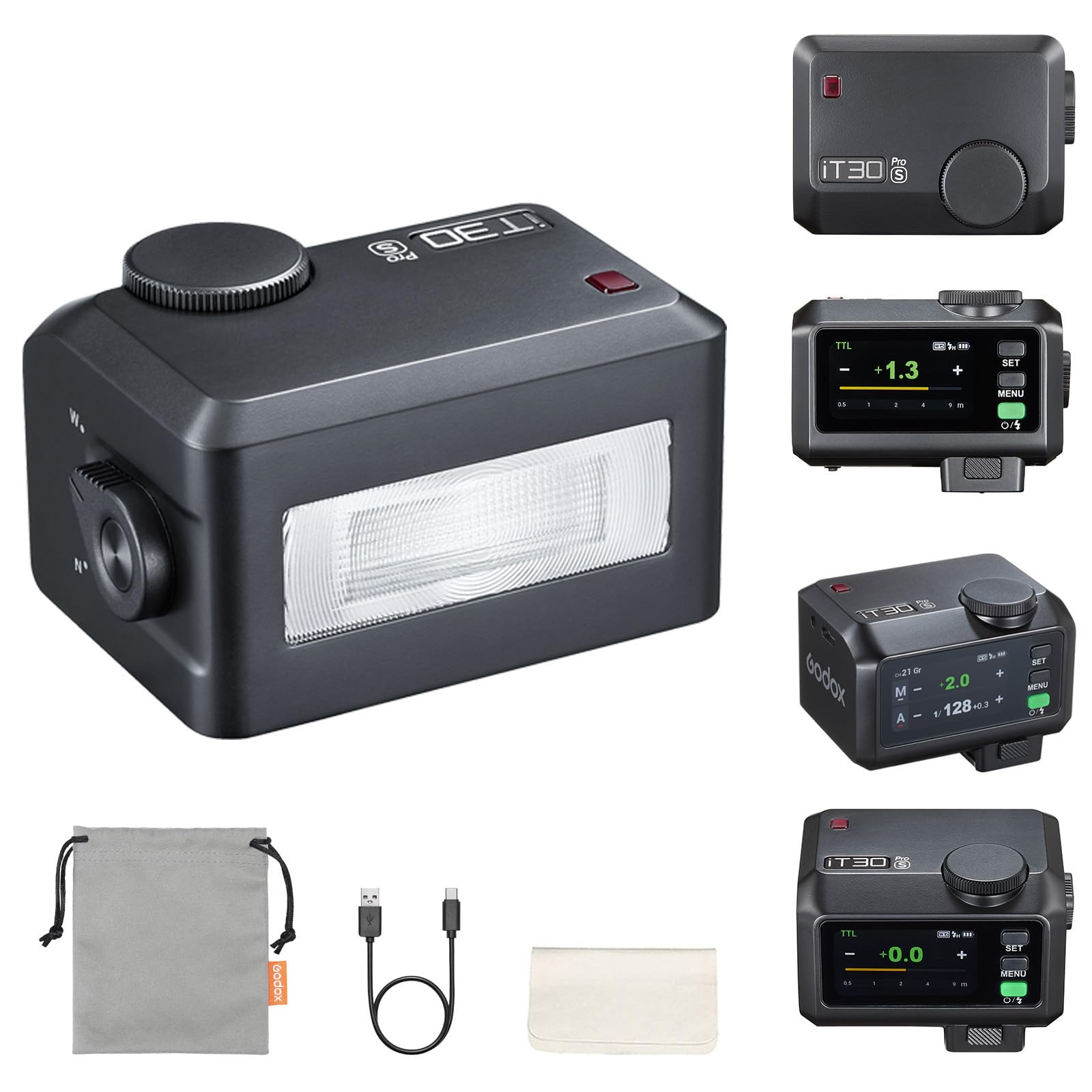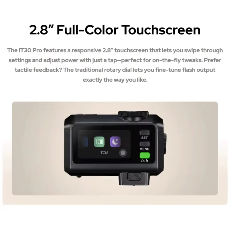 Le GODOX iT30Pro S est un flash speedlite compact avec écran tactile, offrant une synchronisation haute vitesse jusqu'à 1/8000s et un temps de recyclage de 1,5 seconde Grâce à la synchronisation haute vitesse jusqu'à 1/8000 seconde, vous pouvez geler les mouvements ou fusionner le flash avec la lumière ambiante sans effort. Godox iT30 Pro S Flash pour Sony Appareil Photo Speedlite,2,4GHz TTL 1 /8000HSS,560 Prises de Vue à Pleine Puissance,GN15,Temps de Recyclage de 1, 5s,Batterie Li-ION 7,4V/900mAh,Griffe Porte-Accessoire 1 Système X sans fil 2,4G 2 Diffuseur intégré 3 Batterie intégrée Recyclage rapide et performance durable : profitez d'un temps de recyclage rapide de 1,5 seconde et jusqu'à 560 flashs à pleine puissance par charge. Il peut être chargé via USB-C ou une banque d'alimentation, de sorte que vous n'avez pas à vous soucier de la durée de vie de la batterie lorsque vous prenez des photos en extérieur. Ce petit concentré de puissance, avec TTL ultra-rapide, HSS fiable et un contrôle polyvalent, change la donne pour de nombreux photographes. Portraits spontanés, reportages dynamiques ou configurations créatives de lumière : ce flash est prêt à sublimer chaque prise de vue Godox I T30 Pro S TTL Mini Flash Pour Sony (Noir Options d'éclairage polyvalentes : avec son diffuseur intégré, cette lampe de poche portable offre une lumière douce et flatteuse, idéale pour les portraits ou la photographie d'événements. Contrôle tactile convivial : l'écran tactile couleur intuitif de 2,8 pouces permet des ajustements rapides des paramètres et des niveaux de puissance en un seul geste. Technologie TTL avancée : découvrez les fonctions de flash TTL de l'iT30 Pro et profitez des réglages automatiques d'exposition.