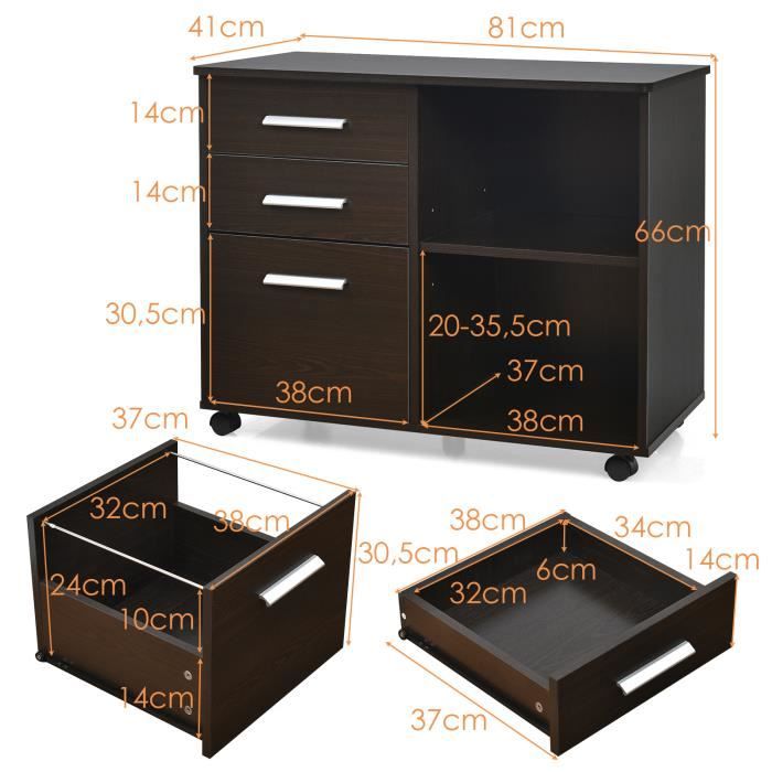 Espace organisé : grâce à la présence de 3 tiroirs et 2 étagères ouvertes, ce meuble d'imprimante avec plan d'appui se révèle une excellente solution pour maintenir une zone de travail organisée et bien divisée. HOMCOM Support d'imprimante - caisson organiseur bureau - 4 niches, placard porte, grand plateau - panneaux particules noir multi-rangement Espace organisé : grâce à la présence de 3 tiroirs et 2 étagères ouvertes, ce meuble d'imprimante avec plan d'appui se révèle une excellente solution pour maintenir une zone de travail organisée et bien divisée La barre réglable dans le tiroir inférieur du meuble d'imprimante s'adapte aux formats A4 et lettre Pratique à portée de main Nous nous efforçons d'offrir du confort à chaque personne et à chaque famille grâce à notre design peu encombrant, son style mutifonctionnel et un look attrayant. Le tiroir supérieur avec serrure et deux clés protège tous les documents sensibles Meuble imprimante avec 2 prises de courant et 2 ports USB pour recharger facilement vos appareils Capacité de poids: 40 kg (total), 5 kg (chaque étagère), 3 kg (chaque tiroir)., Montage requis Homcom vous aide également à rester en forme avec une sélection d'outils de fitness pour l'entraînement cardio et le renforcement musculaire. HOMCOM 80x40x65.5 Cm HOMCOM Meuble Pour Imprimante à 4 Roues Avec 3 Tiroirs, 2 Meuble Imprimante Industriel Marron Meuble imprimante avec 3 tiroirs et 2 étagères pour trouver place à chaque accessoire de bureau Optimisez l'organisation de vos affaires de bureau à la maison ou au travail avec ce superbe support à imprimante sur roulettes multi-rangements Avec stabilité et confort à l'esprit, nos produits seront le meilleur choix. Dimensions totales : 80 L x 40 P x 65,5 A cm. Tous les appareils peuvent être alimentés grâce aux prises de courant et aux ports USB intégrés, tandis que les documents seront protégés par le tiroir supérieur équipé d'une serrure. Son aspect bois foncé offre un rendu élégant et au style industriel , Montage requis Il y a également un trou passe-câble à l'arrière pour disposer les câbles en rangées ordonnées Zone sûre : le grand tiroir de notre meuble porte-imprimante est équipé d'une barre réglable adaptée pour insérer et accrocher des documents au format A4 ou lettre, tandis que le tiroir supérieur est équipé d'une serrure pour garder en sécurité tous les fichiers confidentiels Tout en ordre Nous nous engageons à vous aider à tout garder bien organisé et nous essayons de vous offrir le plus grand espace possible pour garder en ordre. Trouvez l'ordre ultime pour le studio ou le bureau avec le meuble d'imprimante HOMCOM, afin que vous puissiez avoir tout ce dont vous avez besoin à portée de main.
