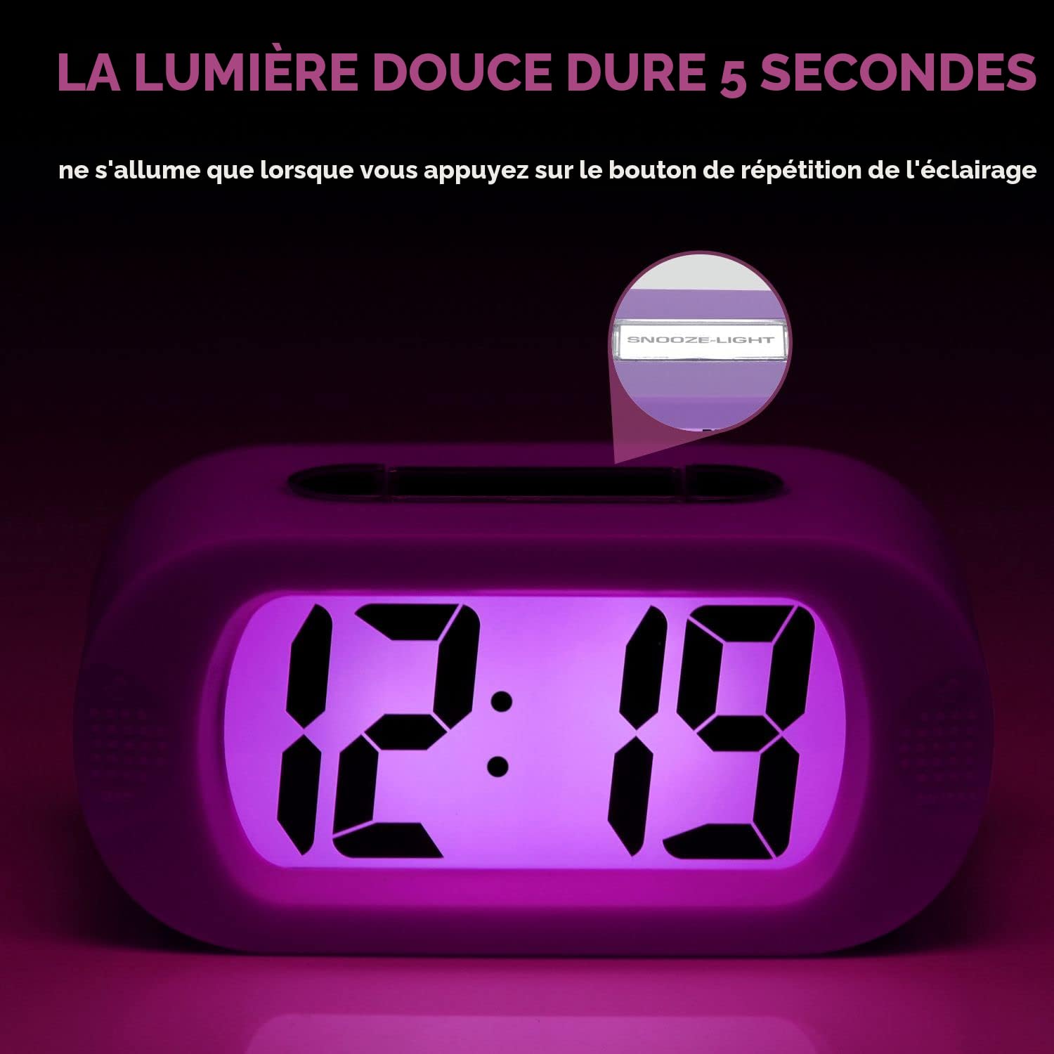 * Conversion des heures : 12 heures/24 heures. Excellent Thanksgiving et Noël. * Le bip accélère toutes les quelques secondes si vous ne mettez pas ou éteignez l'alarme immédiatement, ce qui est agréable pour les personnes qui peuvent dormir à travers les alarmes. Emballage et utilisation : comprend 1 réveil numérique, 1 câble USB, et 1 manuel d'utilisation (français non garanti) pour une installation simple. Design durable et portable : fabriquée avec une coque en silicone résistante aux chocs, cette horloge résiste aux chutes et est légère pour un transport facile. Réveil Portable Snooze 8 Minutes Plumeet Facile à Régler, Grand Réveil Numérique LCD Alarme Horloge Fonction Snooze, Avec Veilleuse, Alarme Progressive, Cadeau Pour Enfants (Blanc Réveil Voyage Rose Grand écran numérique : doté d'un grand écran LCD avec des chiffres clairs, ce réveil est facile à lire de l'autre côté de la pièce, même en cas de faible luminosité. L'affichage automatique et la lisibilité à grands chiffres dans différents paramètres, des bureaux aux voyages de vacances. * Bien fait, pratique à saisir, léger, facile à installer, parfait pour les enfants, les adolescents et les adultes, vous pouvez le mettre de toute façon sur la chambre, le bureau, la cuisine, le bureau ou le transporter pour voyager. Les boutons simples pour les paramètres d'alarme et de lumière le rendent facile à utiliser pour les enfants, les adolescents et les adultes. RÉVEIL 12/24 HEURES affichage température à piles/USB moderne EUR 20,47... Caractéristiques : * Horloge numérique pour enfants : pour un réglage facile, grand écran LCD grand nombre pour une lecture facile, rétroéclairage doux pour garder votre sommeil en quelques secondes seulement si vous appuyez sur le bouton snooze-light, petite taille idéale pour les voyages, couleur mignonne pour les enfants. * Caractéristiques spéciales : automatique, grand écran, répétition, alarme., * Dimensions : 6,8 x 14,9 cm. Son rétroéclairage doux s'active uniquement avec le bouton snooze-light, votre sommeil n'est pas perturbé, parfait pour les chambres et les voyages. * Coque de protection en silicone résistante aux chocs qui peut être emportée n'importe où et aide à protéger l'horloge contre les chutes, 3 piles AAA 1,5 V (non fournies). Découvrez ce réveil craquant en silicone souple, sûr et fiable. Il apaise efficacement l'anxiété du coucher, pour des matins plus agréables et un sommeil réparateur Veilleuse magnétique de chambre à coucher 4 pièces, rechargeable Contenu de l'emballage : 1 réveil numérique., 1 câble USB.