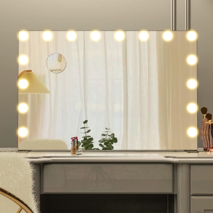 Chende - Miroir de Maquillage Hollywoodien Blanc avec Lumières, Grand Miroir Maquillage LED Miroir De Maquillage éclairé De Bureau, Noir Avec Lumière De Miroir Pour Coiffeuse Cadre métallique : Le cadre du miroir de table éclairé est fabriqué en métal de haute qualité, à la texture délicate et raffinée, à la fois pratique et esthétique, et rehausse le style général de la coiffeuse Miroir de maquillage LED simple, noir, blanc, argent, or, avec cadre en métal, Classique et polyvalent, il offre une vision claire et des effets lumineux professionnels, que ce soit pour un maquillage rapide le matin, un maquillage délicat le soir ou pour réaliser des vidéos beautéStyle : SimpleForme : ArquéeCouleur : Noir, Blanc, Argent, OrMatériau : Verre/MétalDimensions : 30 x 40 cm, 40 x 55 cm, 50 x 70 cmFonctions : Tactile intelligent, rotatif, avec lumière, à brancherEntretien : La surface du miroir peut être nettoyée avec du dentifrice ou un diluant nettoyant à 30 % pour les taches tenaces, et le cadre avec un chiffon sec Éclairage LED : Ampoule LED douce, lumière uniforme et douce, sans scintillement ni éblouissement. Miroir de maquillage éclairé pliable – Maroc Le miroir de maquillage LED restitue avec précision le teint et le maquillage Bureau de aquillage avec iroir éclairé et plateau en verre – Grande... Rotation : Le miroir peut être tourné librement sous plusieurs angles, et le miroir grossissant peut être ajusté à n'importe quel angle selon les besoins pour répondre aux besoins de divers utilisateurs et faciliter le maquillage L'éclairage LED permet de mettre en valeur les détails du maquillage du visage et du cou