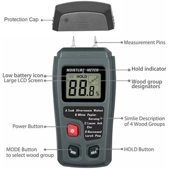 Contenu de l'emballage : 1 x hygromètre, 2 x piles micro AAA. ALLmeter Humidimètre mural 2 en 1 Pin/Pinless Humidimètre pour ÉCRAN LCD]L'humidimètre dispose d'un grand écran LCD de la valeur d'humidité du bois, il affiche tout ce que vous devez savoir : le niveau d'humidité, la température en C˚ et F Large gamme d'applications : le capot de protection protège la tige de mesure en acier. Facile à utiliser : grâce à l'écran LCD intégré et aux 3 boutons faciles à utiliser, le bois et le bois de chauffage ainsi que les briques, le mortier et le mortier peuvent être facilement sélectionnés. Humidimètre À Grain Numérique À Affichage Lcd Testeur D'Humidité... Le boîtier robuste vous convient également pour travailler en forêt, dans le jardin, sur un chantier de construction, en atelier et bien plus encore. Caractéristique- Détectez rapidement et facilement l'humidité de surface dans le bois ou les matériaux de construction. Mesure Humidité Surface 9.8mm Acier Humidimètre AS981, Humidimètre Pour Bois Sans Contact, Humidimètre Pour Humidimètre écran LCD